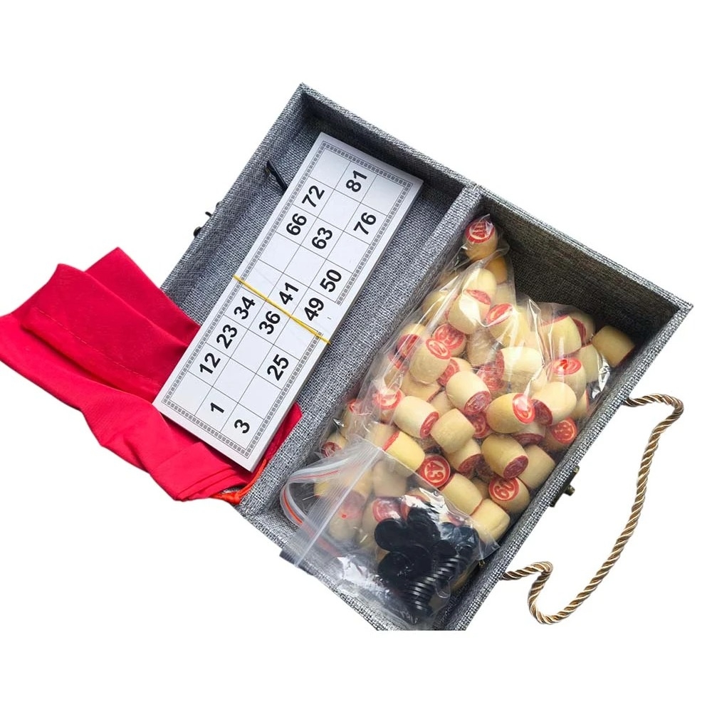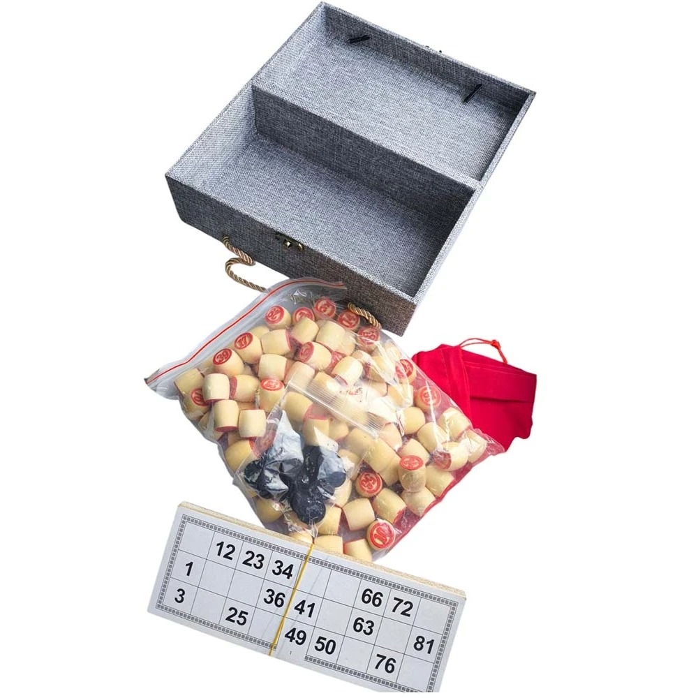 Настольная игра "Русское лото" включает в себя 24 карточки, разделенные на клетки. Специальные пронумерованные бочонки, выполненные из дерева, нужно перемешать в мешке и, вытаскивая не глядя, собрать на своем поле указанные числа.