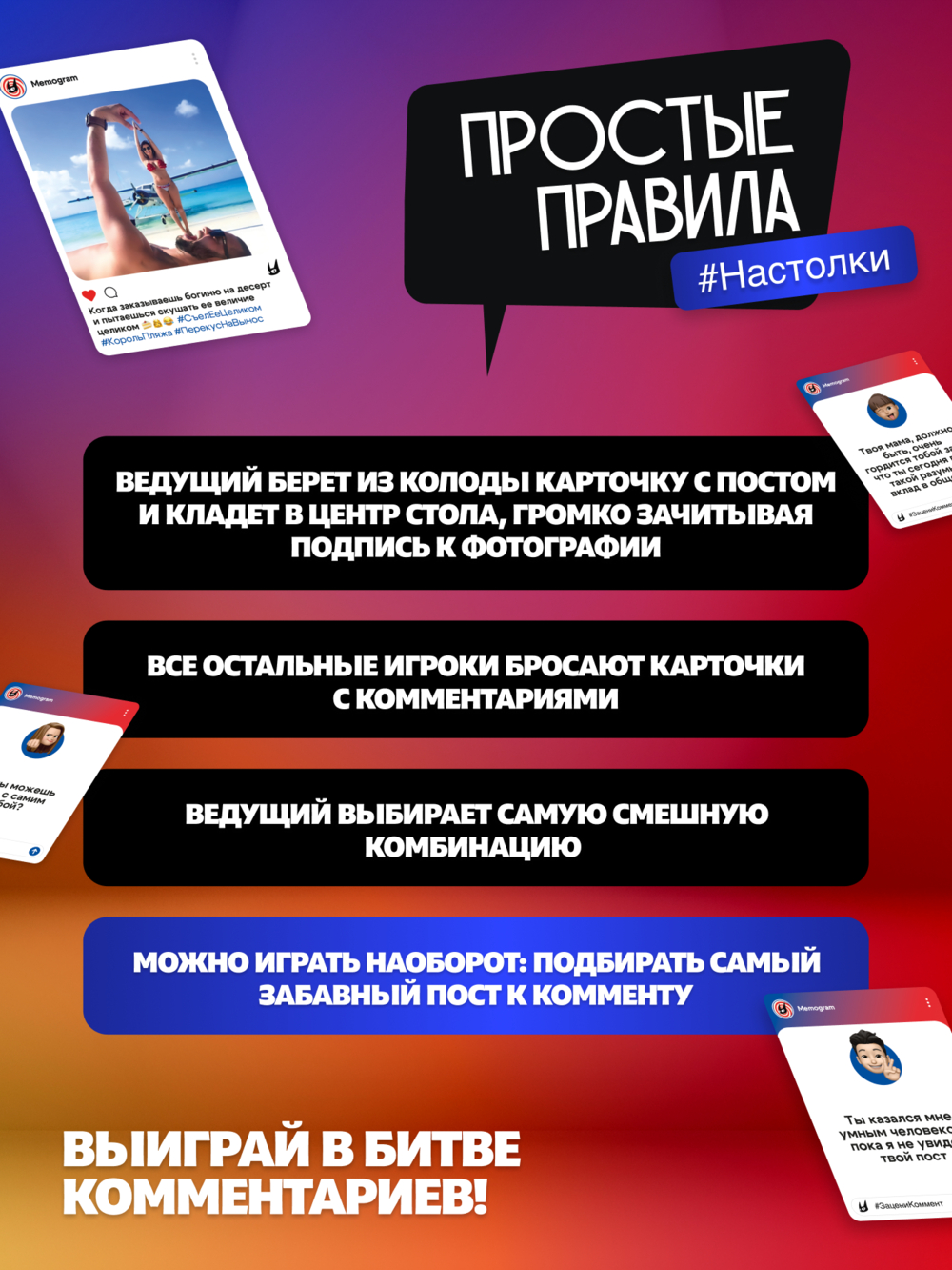 Правила игры просты: карты с комментами розданы, ведущий вытягивает карту поста и выкладывает её (как настоящий пост!) на стол.