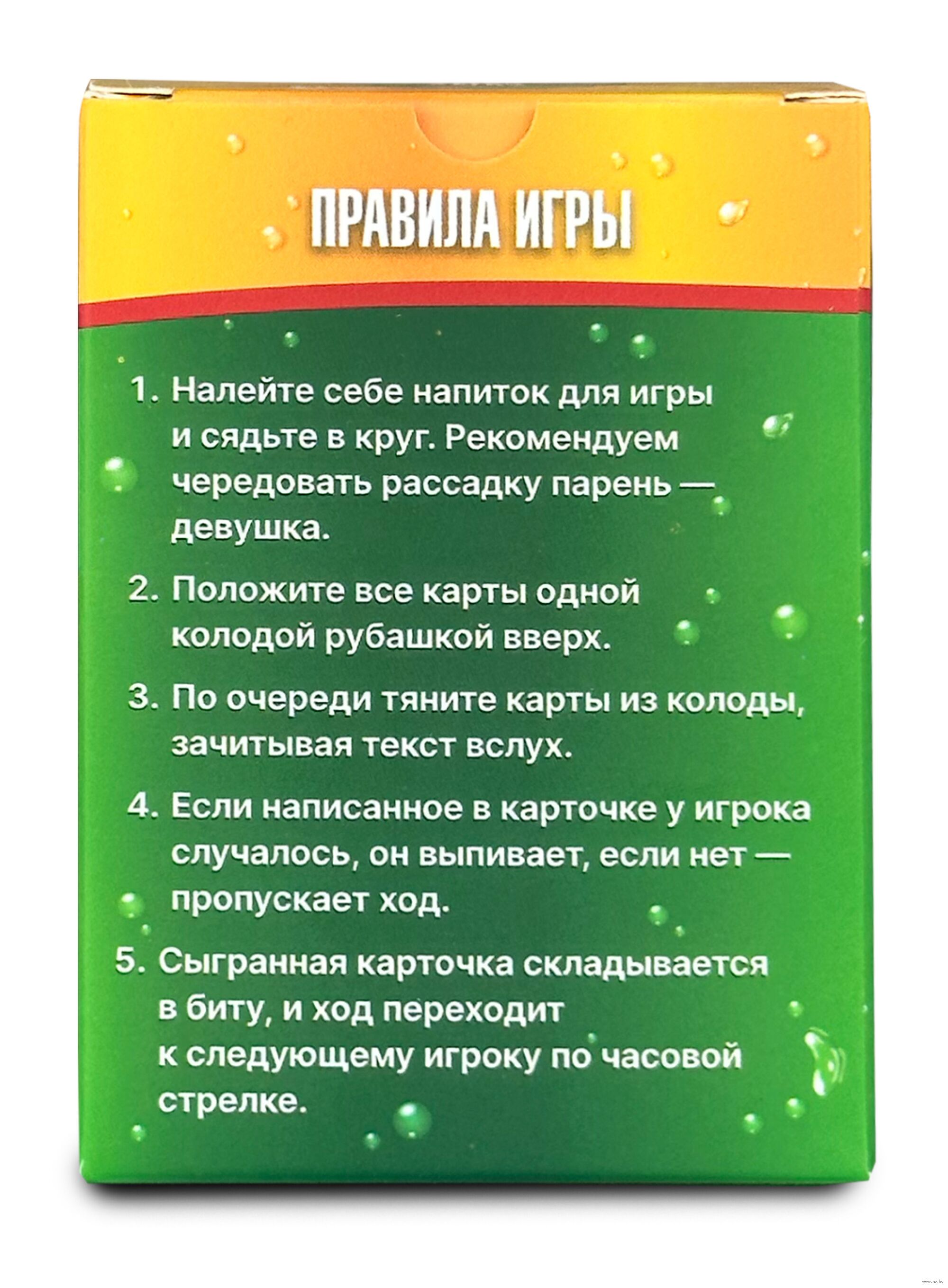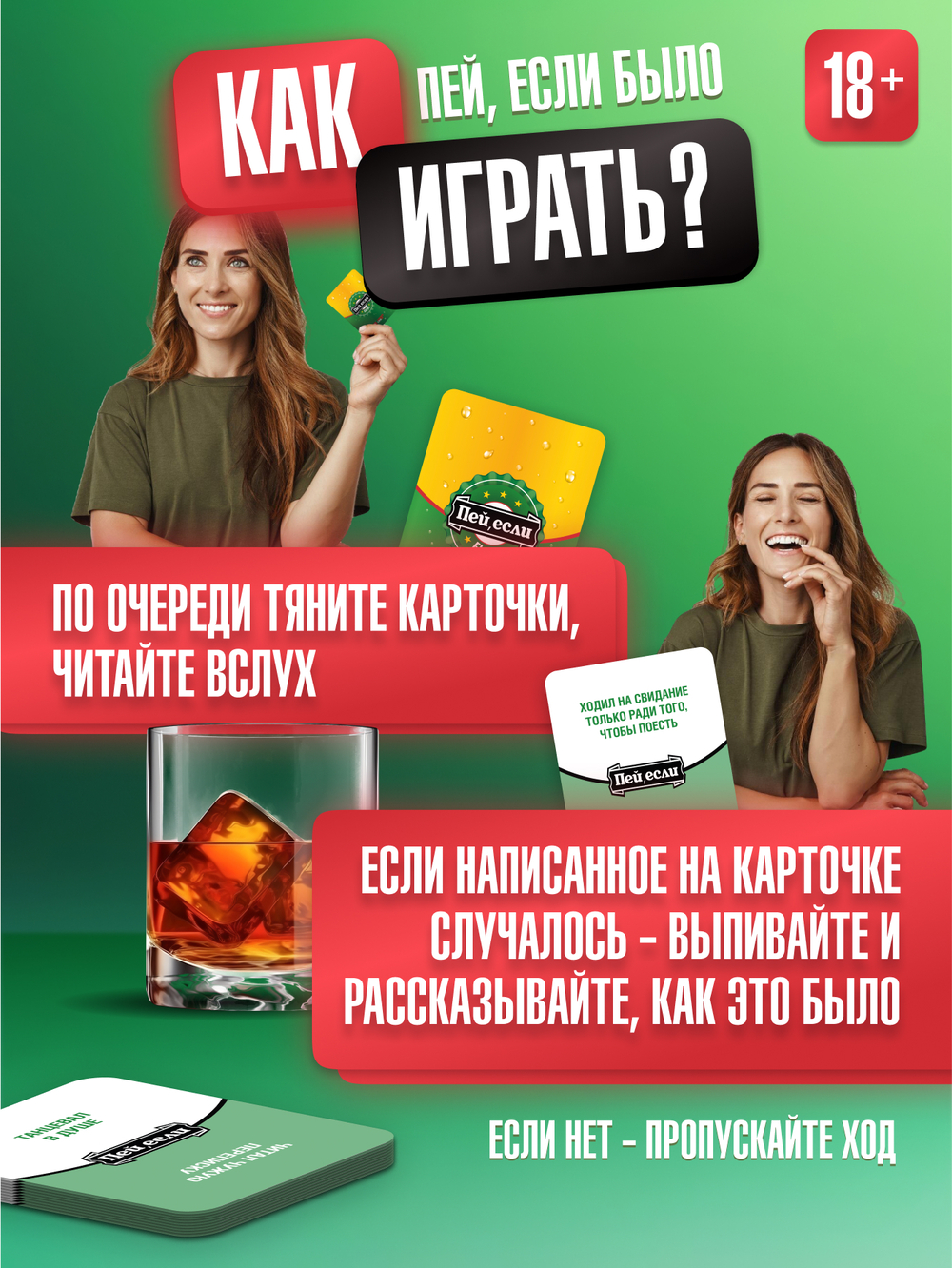 Игроки по очереди тянут карты – и если попадали в вытянутую ситуацию, то пьют и делятся с компанией подробностями. Если нет, то ход переходит к следующему весельчаку.