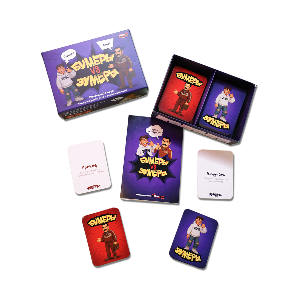 Играть в настолку "Бумеры VS Зумеры" веселее, чем гуглить слова! Эта увлекательная и смешная викторина предлагает посоревноваться в знании сленга двух поколений – бумеров и зумеров.