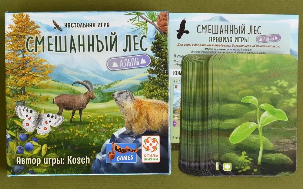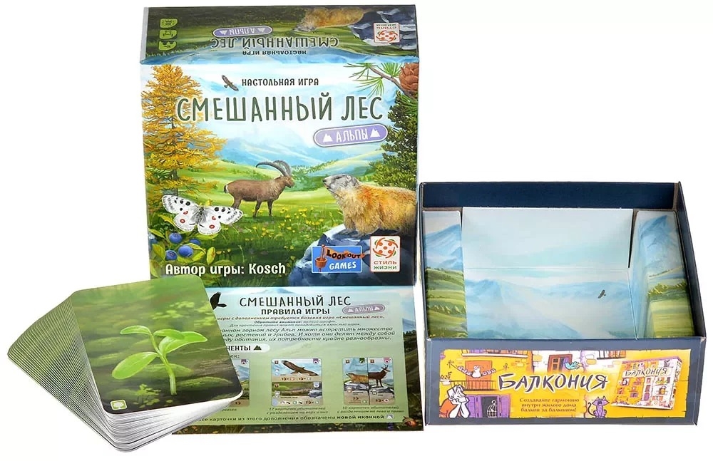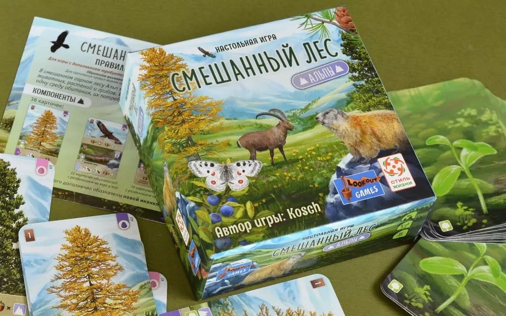Дополнение "Альпы" расширит ваши возможности по созданию экологического рая для лесной флоры и фауны. В колоду добавятся 36 новых карт, включая две дополнительные породы деревьев и множество новых животных, растений, грибов и даже яркую бабочку! Эти карты не только увеличат видовое разнообразие в вашем лесу, но и откроют новые условия для построения комбинаций.