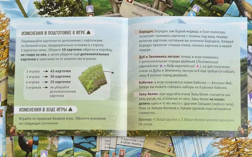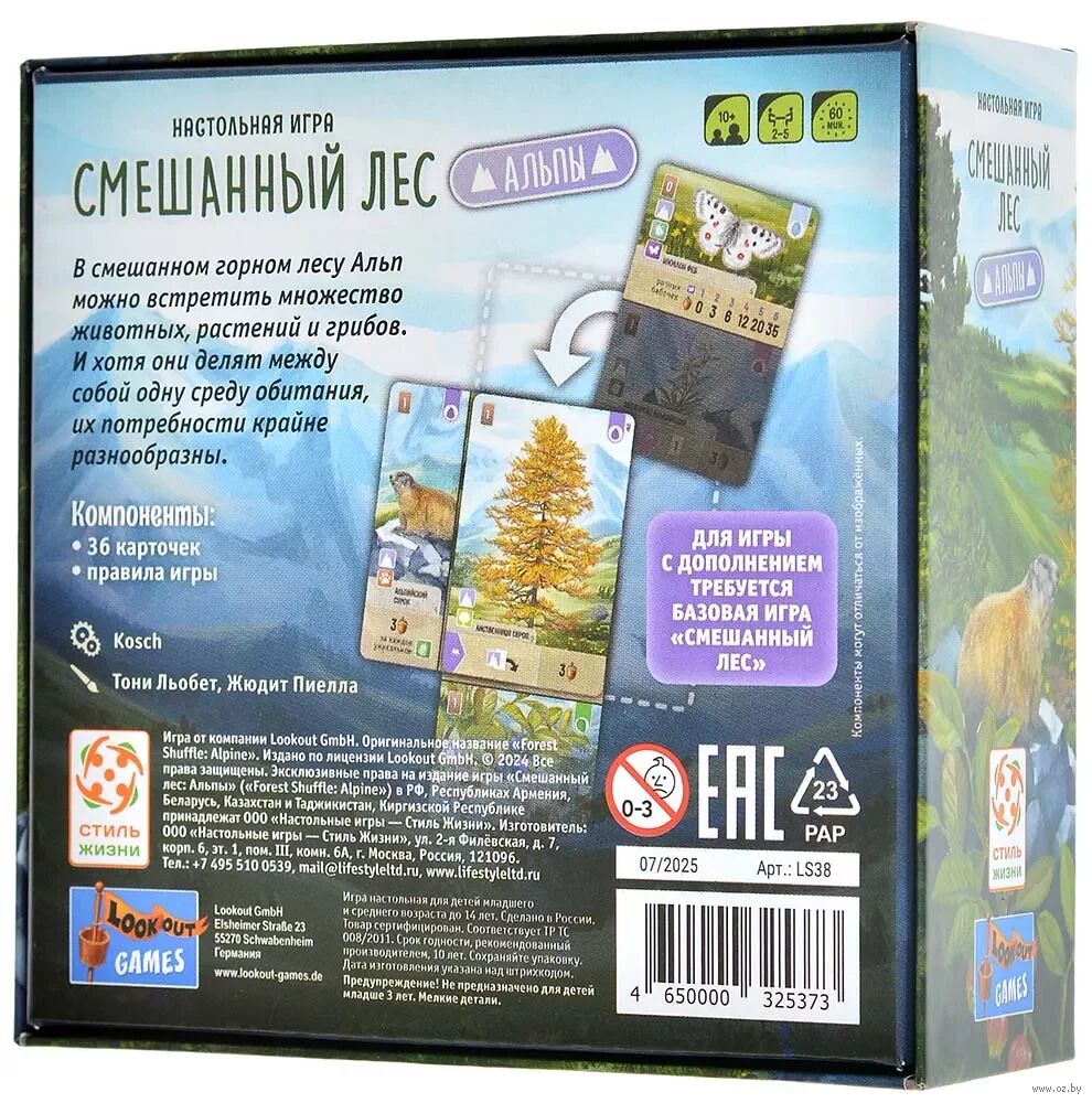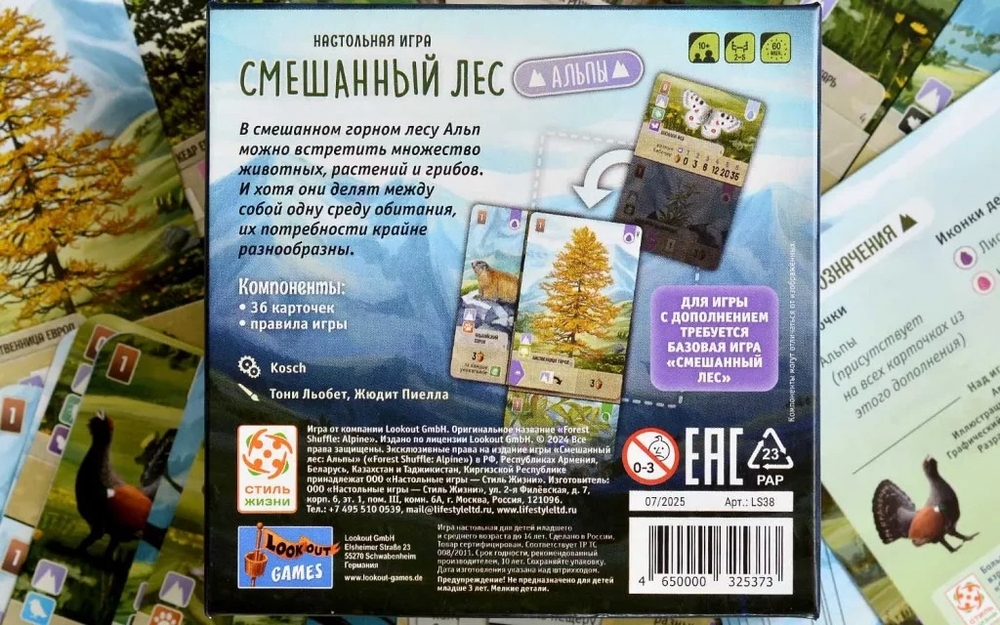 Обратите внимание: размер карт в дополнении "Смешанный лес: Альпы" отличается от карт первого тиража базовой игры "Смешанный лес". Для комфортной игры можно использовать протекторы 57x89 мм. В новом тираже базовой игры размер карт совпадает с дополнением.