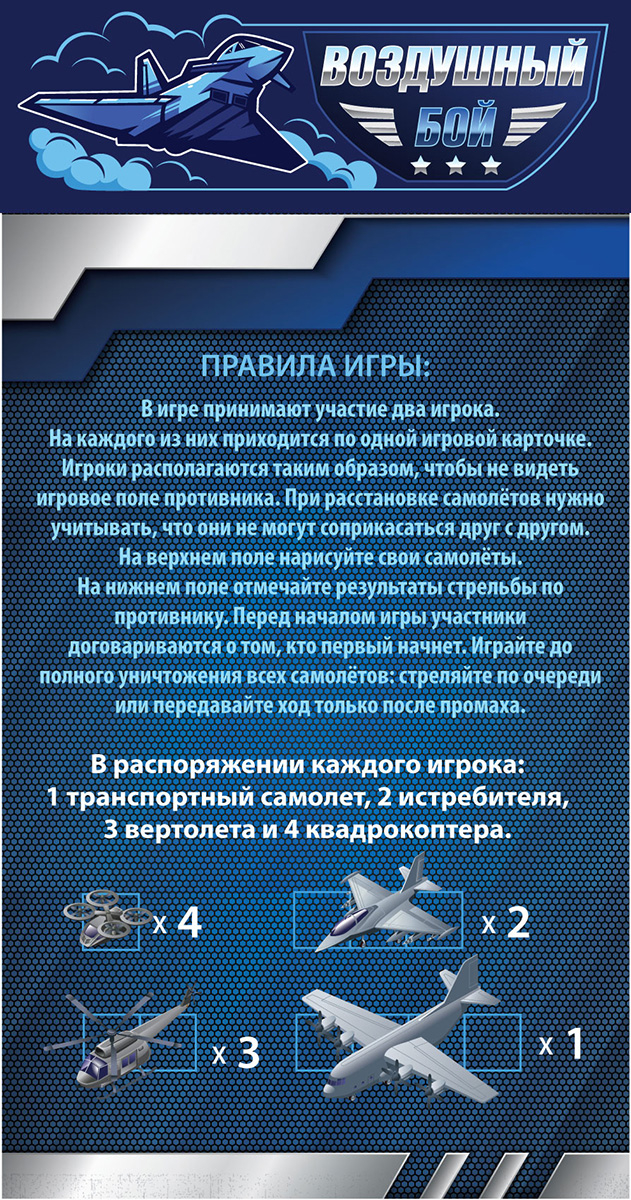 Играйте до полного уничтожения всех самолетов противника: стреляйте по очереди или передавайте ход только после промаха.