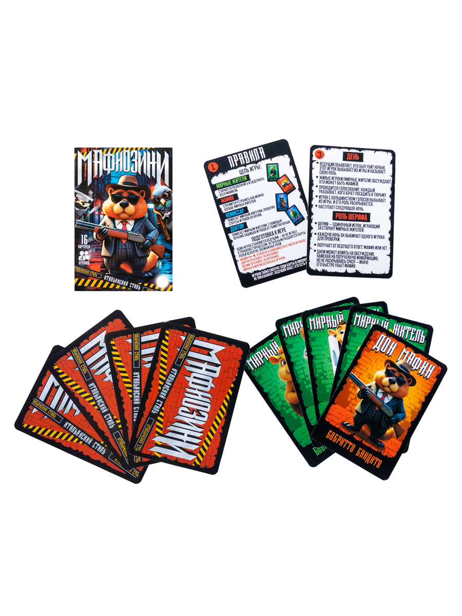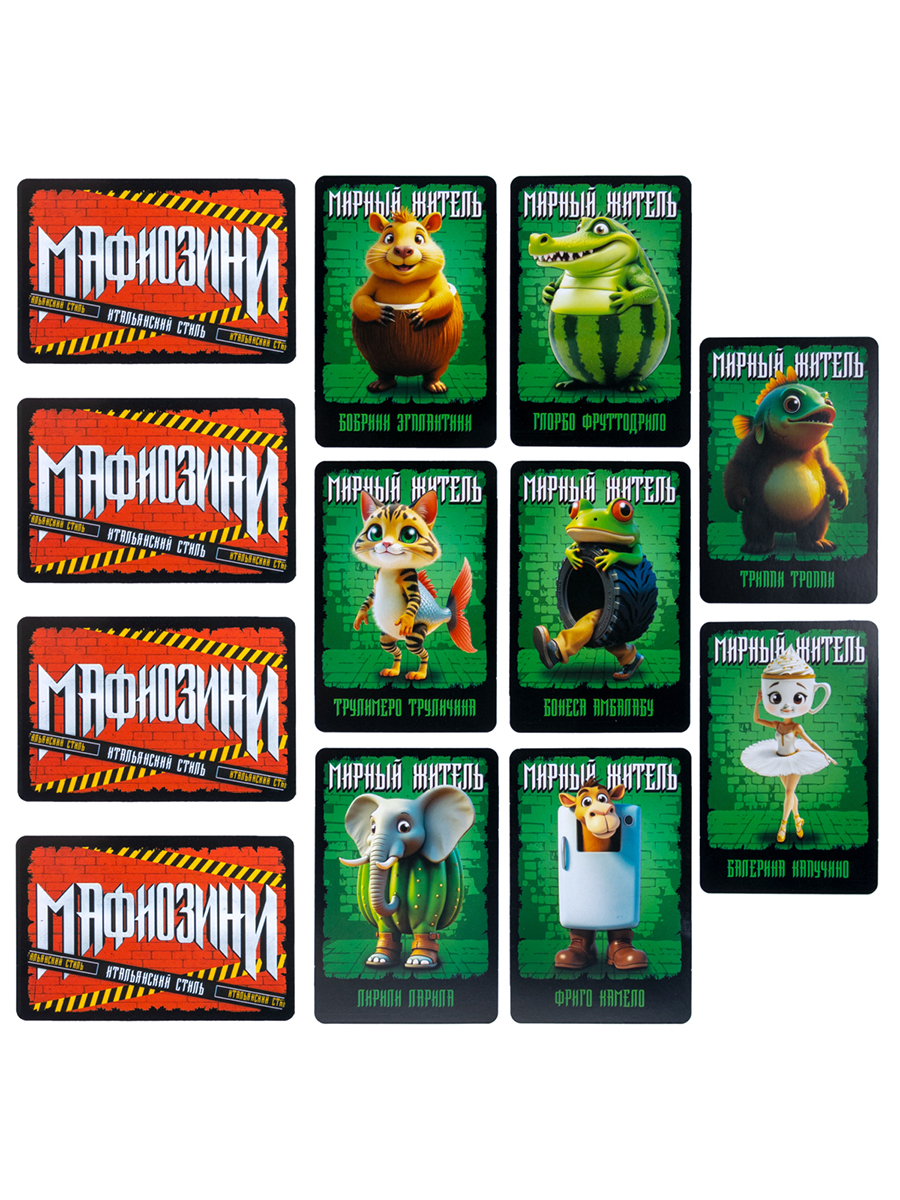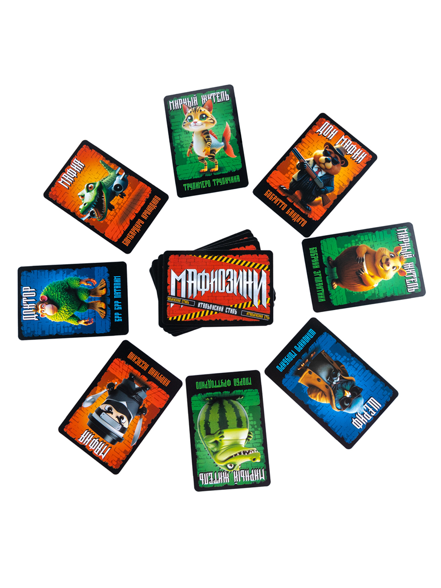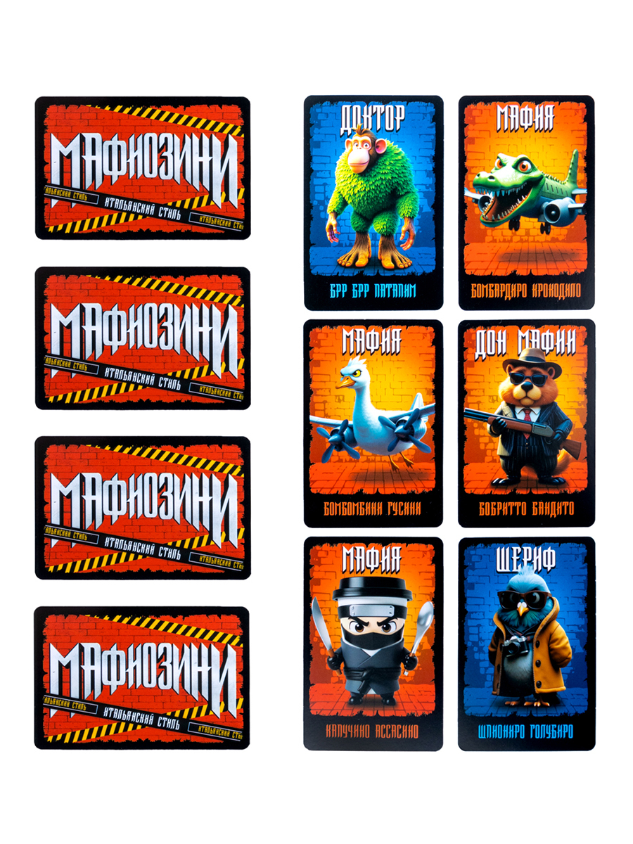 Встречайте "Мафиозини" – настольную игру, которая перенесет вас в самое сердце солнечной Италии, где за каждым углом скрываются интриги и конечно же, мафия! Эта игра – классическая "Мафия", но с новым, ярким акцентом и колоритными персонажами, узнаваемыми итальянскими животными мемами.