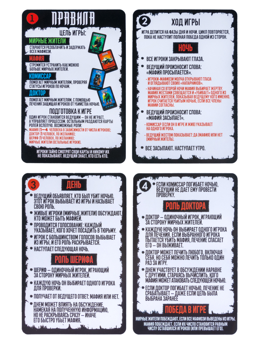 Каждый раунд – это чередование дня и ночи. Днем город шумит, спорит и голосует, пытаясь вычислить злодеев среди своих. Ночью мафия выходит на охоту, комиссар ведет расследование, а доктор спешит на помощь. Интриги, блеф, подозрения и неожиданные повороты – вот что ждет вас в каждой партии "Мафиозини"!