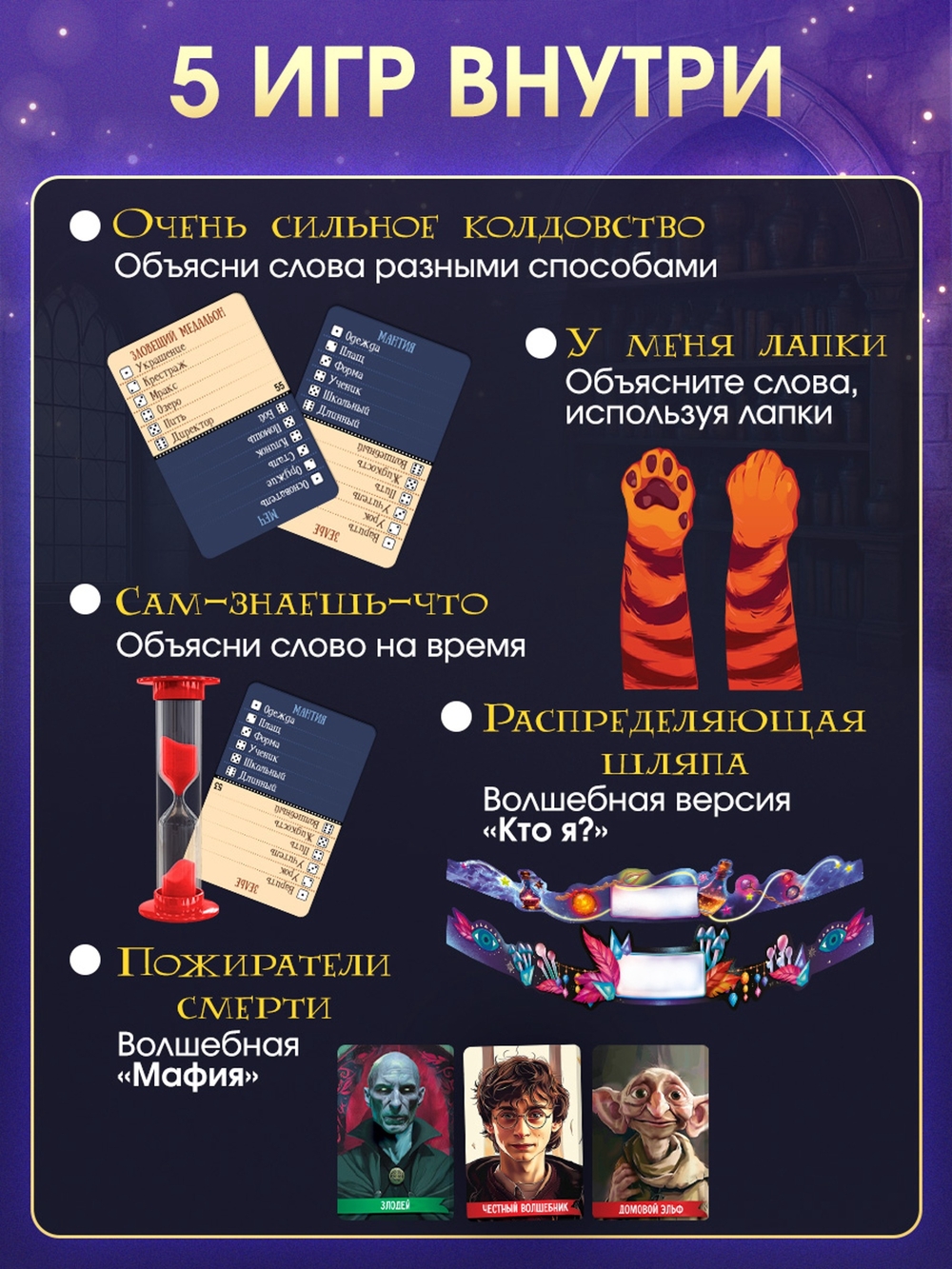 Набор "Всевозможные волшебные настолки" – это пять захватывающих игр, которые переносят игроков в мир магии, тайн и веселья. Идеально подойдут для семейных вечеров, встреч с друзьями или тематических праздников.