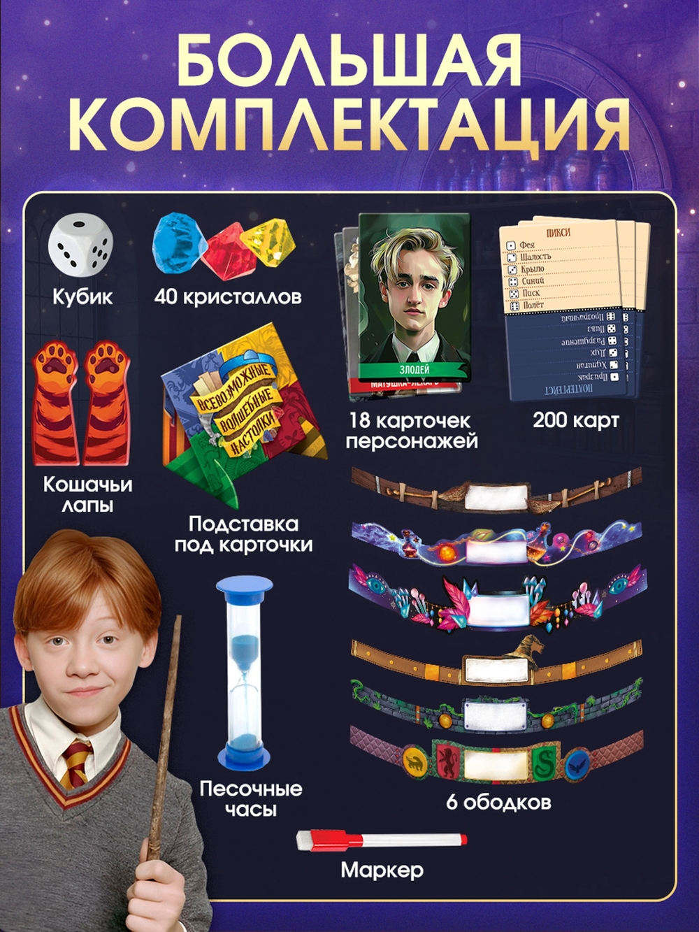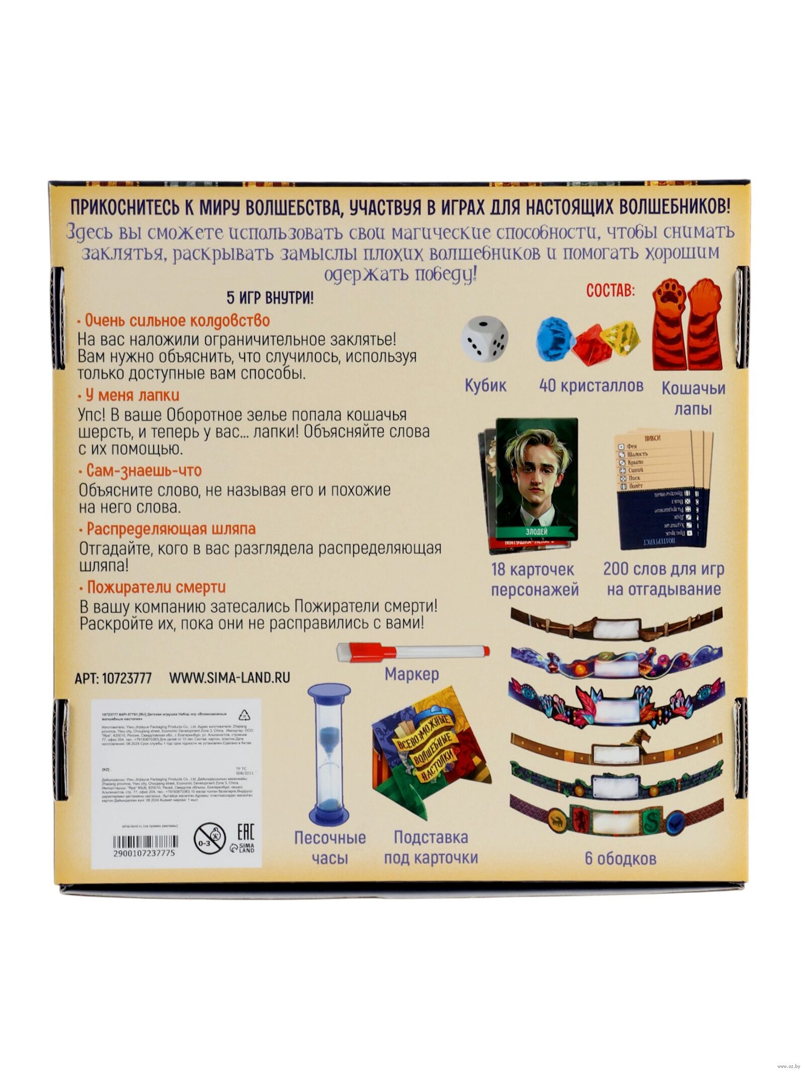 Внутри вы найдете всё необходимое: кубик, песочные часы, карточки персонажей, маркер, ободки и даже кристаллы. Игры помогают развивать коммуникацию, логику и креативность. Это не просто развлечение, но и инструмент для развития мягких навыков.