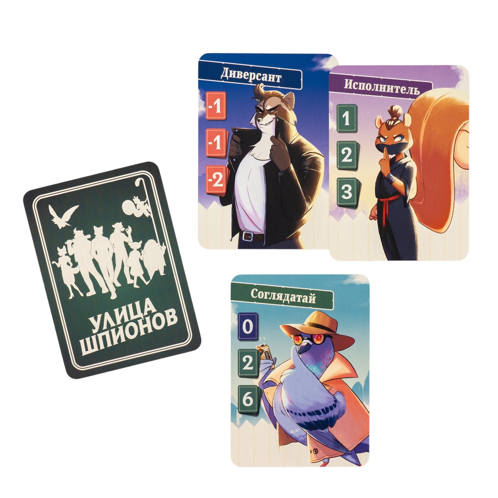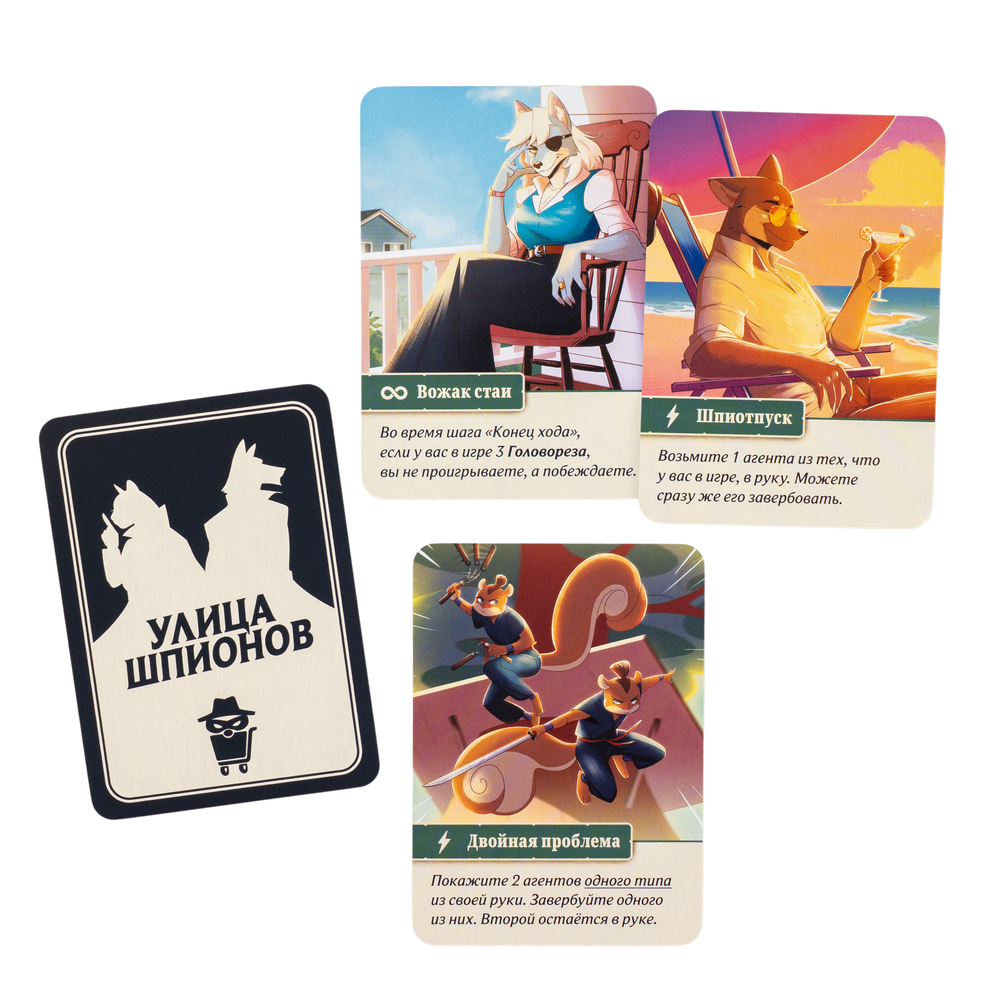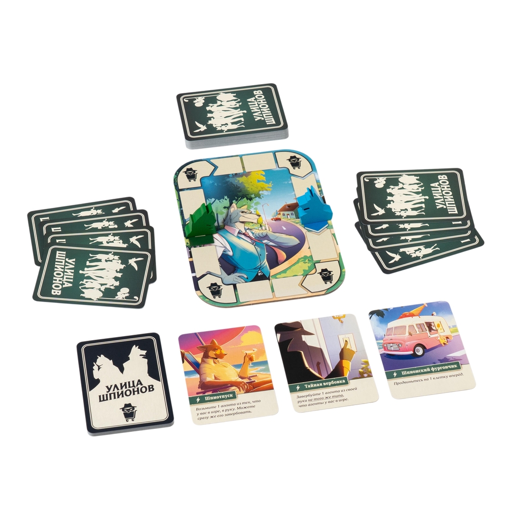 Улица Шпионов – быстрая дуэль с простыми правилами. Каждый ход вы предлагаете противнику две карты: одну в открытую, другую взакрытую. Конечно, не все карты одинаково полезны – и это открывает огромное пространство для блефа!