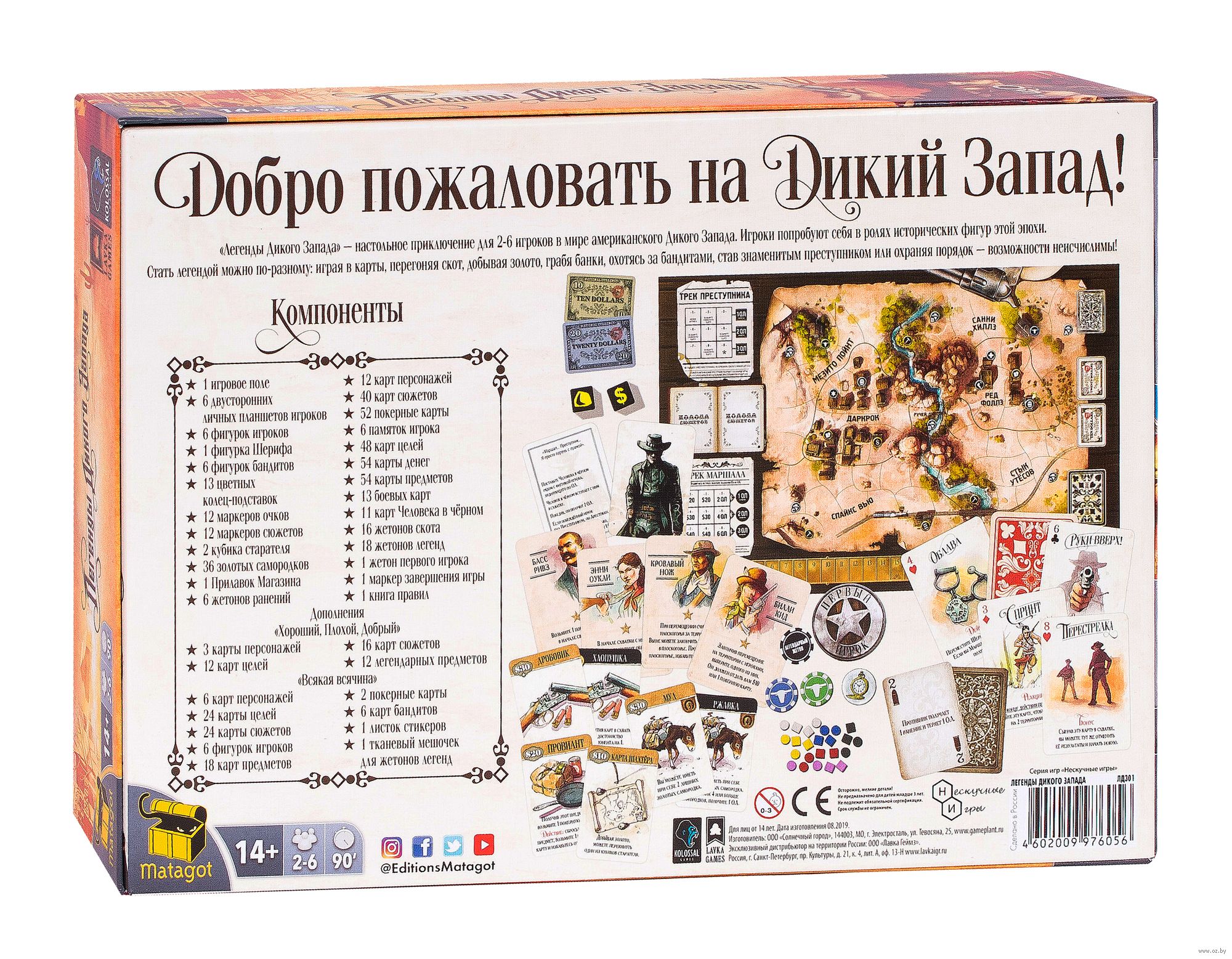 Бэнг! Бэнг! Готовь шляпу и кольт, ковбой, мы отправляемся в самое грандиозное путешествие по Дикому Западу, которое только можно представить! "Легенды Дикого Запада" – это не просто настольная игра, это целый мир, в котором ты можешь почувствовать себя настоящим жителем прерий. Стань шерифом или бандитом, кладоискателем или пастухом, а может быть самым удачливым игроком в покер. "Легенды Дикого Запада" позволят тебе с головой погрузиться в этот мир.