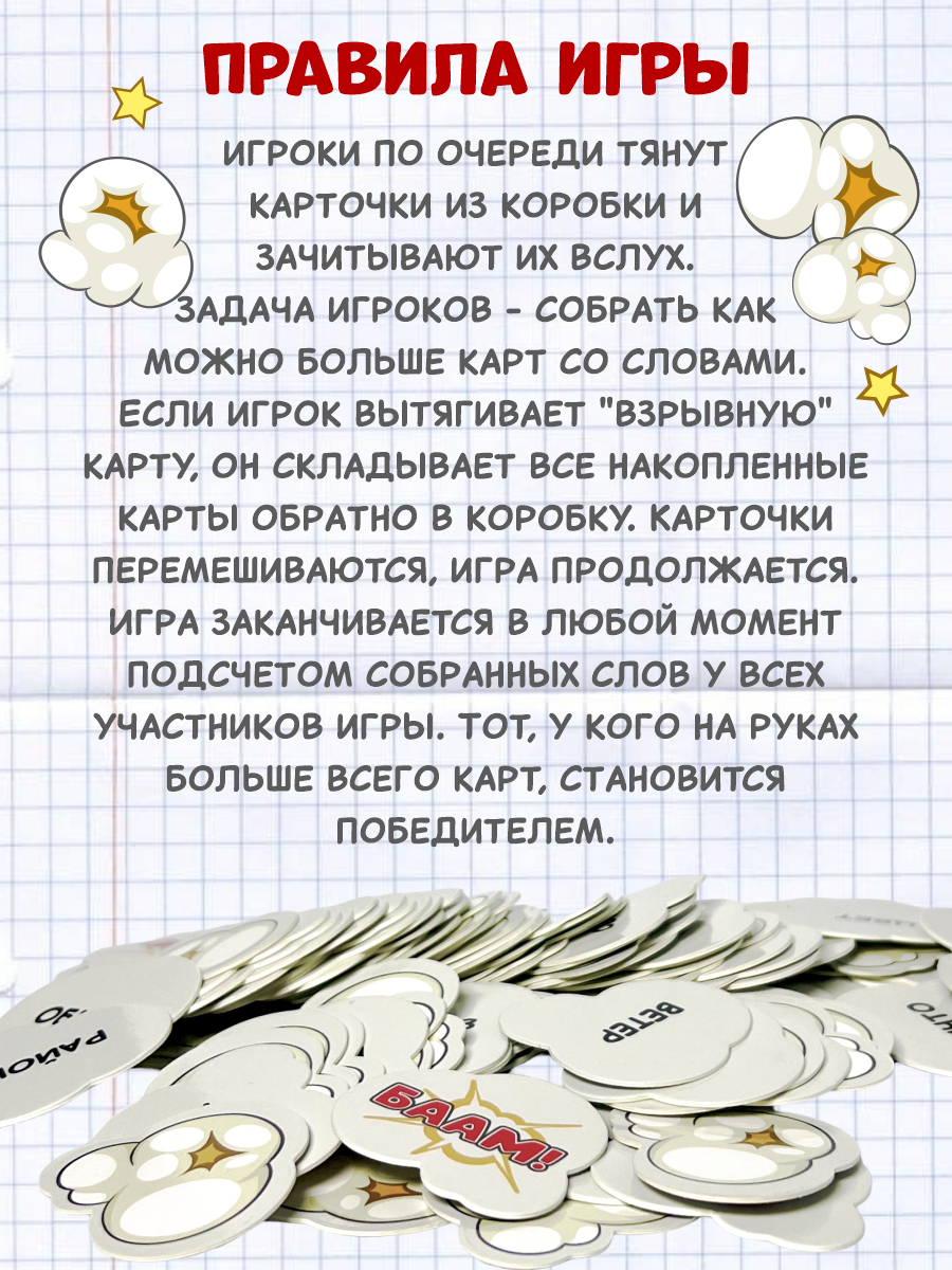 100 фишек-карточек: 92 со словами, 8 со взрывомМы используем файлы cookie для обеспечения удобства работы с сайтом и его контакта с пользователем.