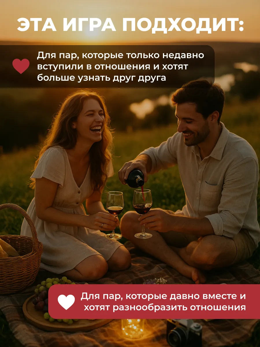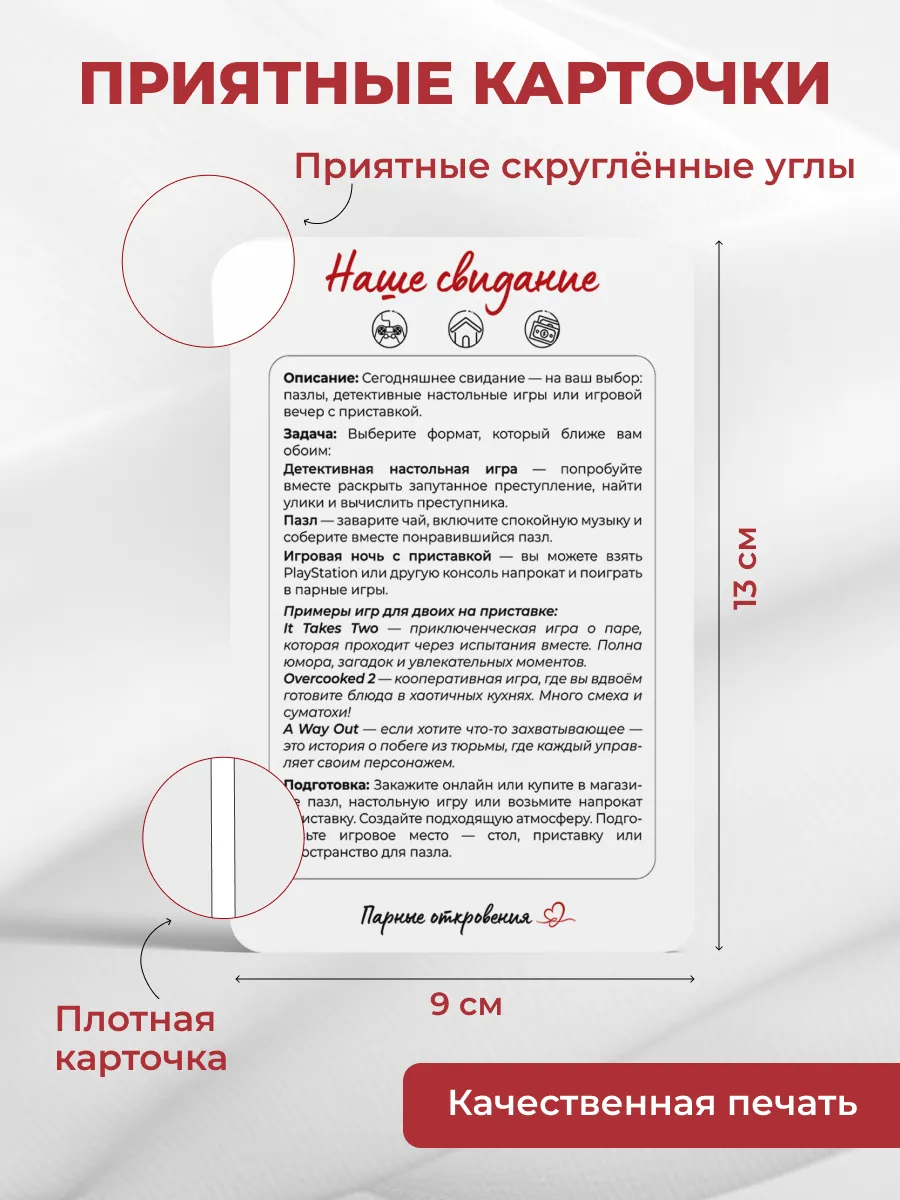 Внутри 33 карточки-идеи для свидания: от уютных домашних вечеров до небольших приключений, которые можно устроить в ближайшее время. Необходимо просто вытянуть карту и сделать это свидание реальностью!