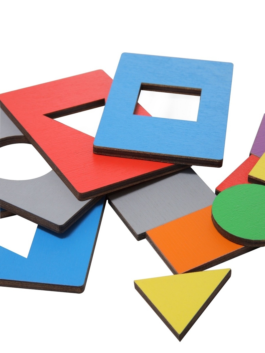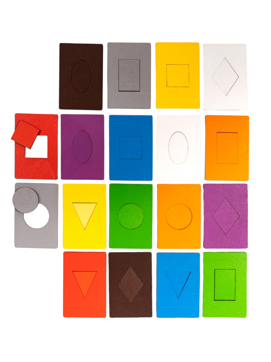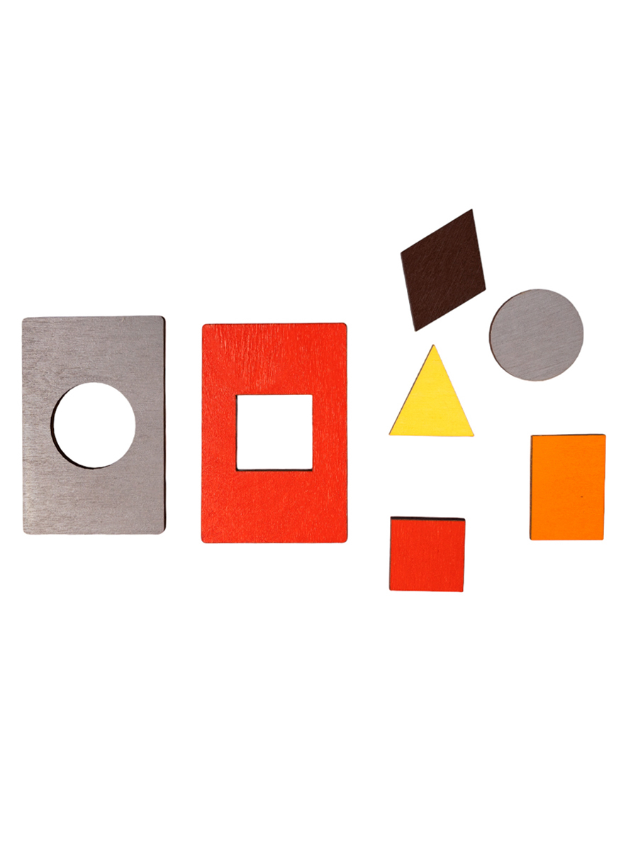 Выложите досочки отдельно, а вкладыши отдельно. Задача ребёнка – вставить подходящие геометрические фигуры в соответствующие прорези, соблюдая цвет.