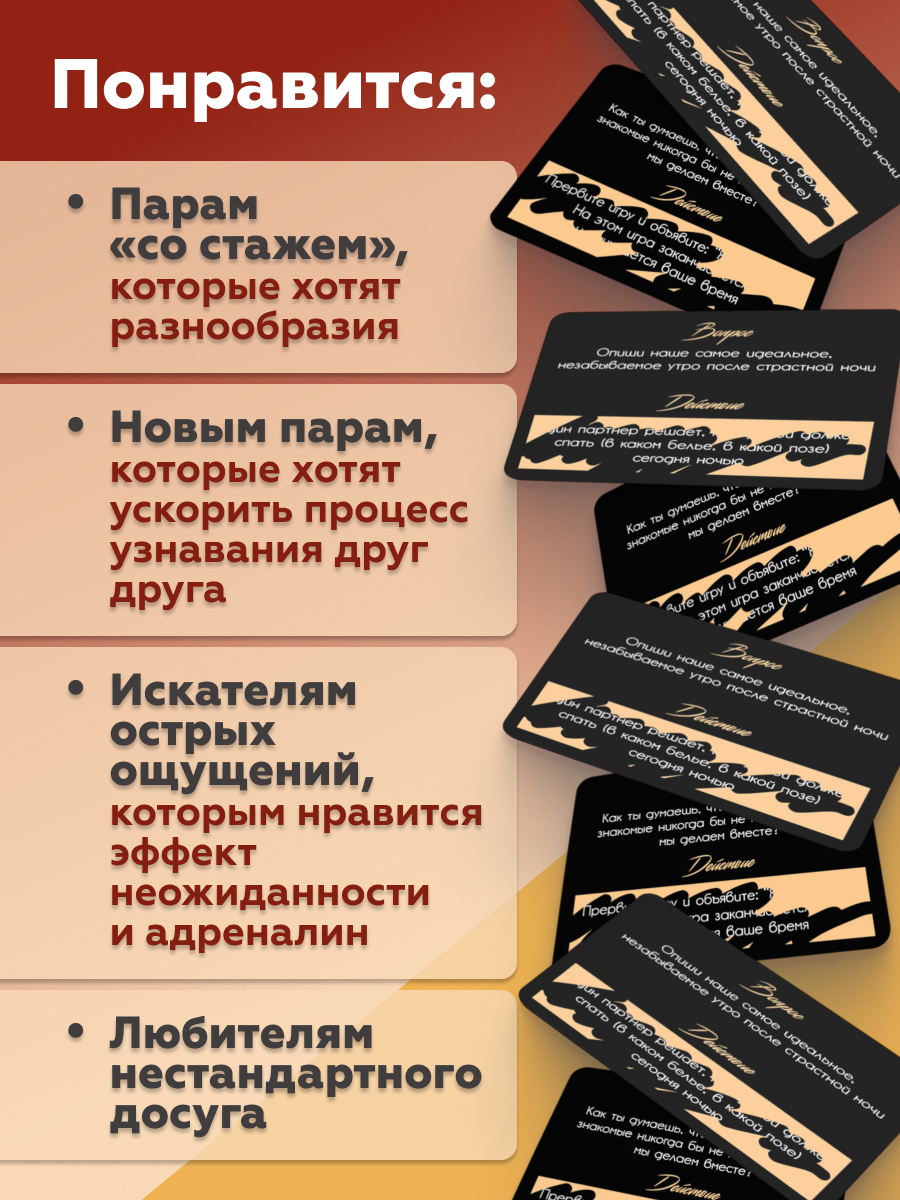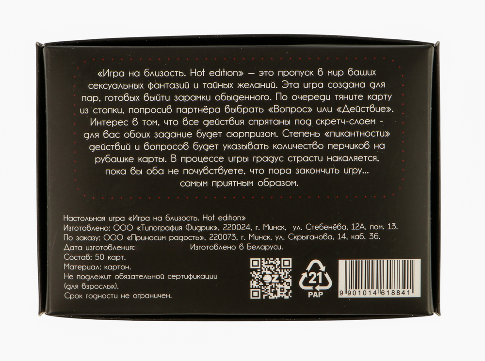 "Игра на близость. Hot edition" – это пикантная настольная игра для двоих, призванная вывести ваши отношения на новый уровень страсти и доверия. Забудьте о стандартных свиданиях – вас ждёт горячий марафон вопросов и действий, направленных на исследование сексуальных фантазий, желаний и опыта друг друга. Идеально подходит для пар, которые готовы к откровенным разговорам и смелым экспериментам.