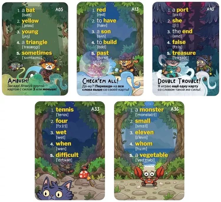 В этой карточной игре дети с лёгкостью запоминают английские слова, сражаясь в магических поединках. Чтобы побеждать в дуэлях, не нужны волшебные палочки – достаточно правильно перевести слово с карточки! Тот, кто первым избавится от всех своих карт или наберёт больше побед, становится чемпионом словесной магии.