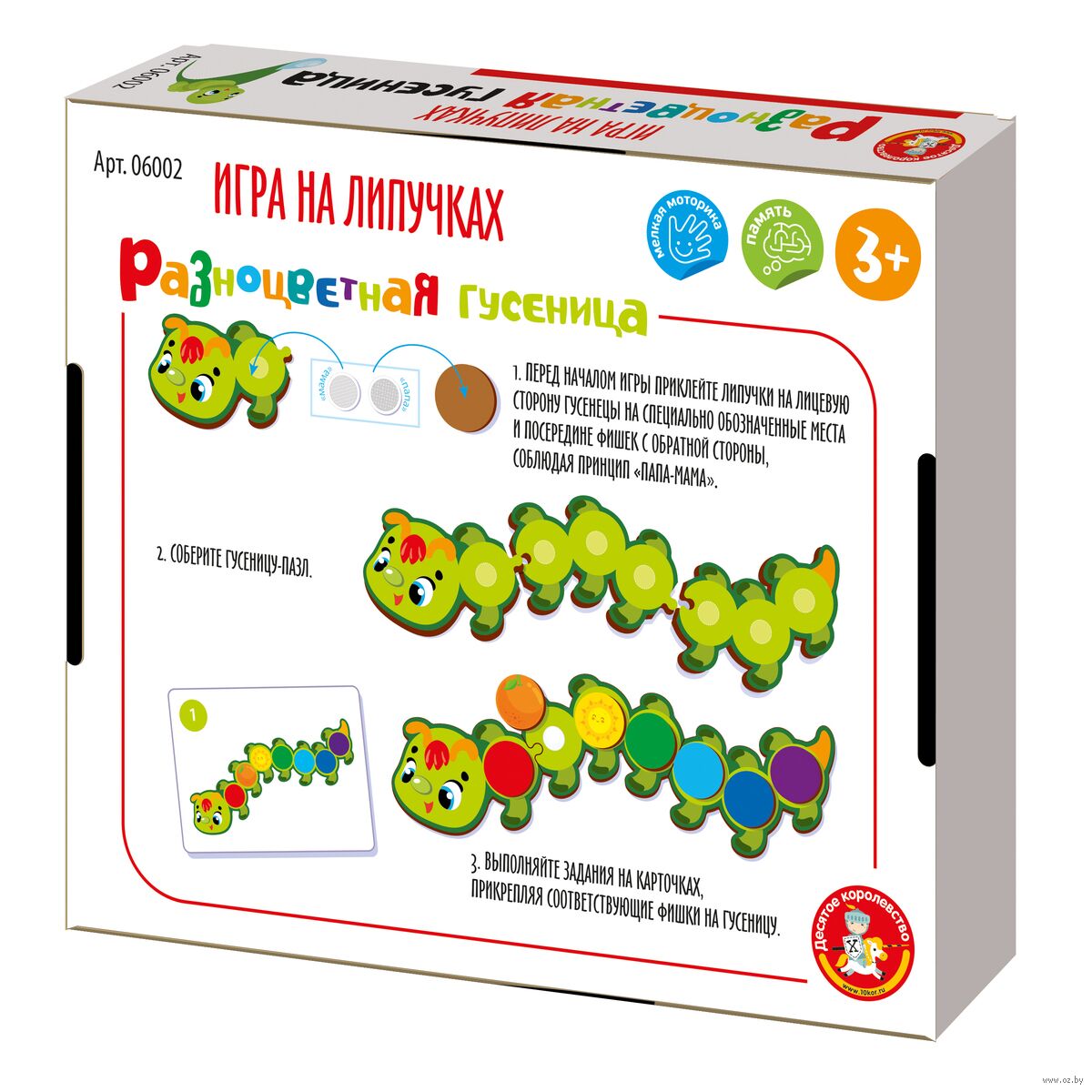 Перед началом игры необходимо приклеить липучки, соблюдая принцип "папа-мама": на середину задней стороны фишек и на лицевую сторону деталей гусеницы.