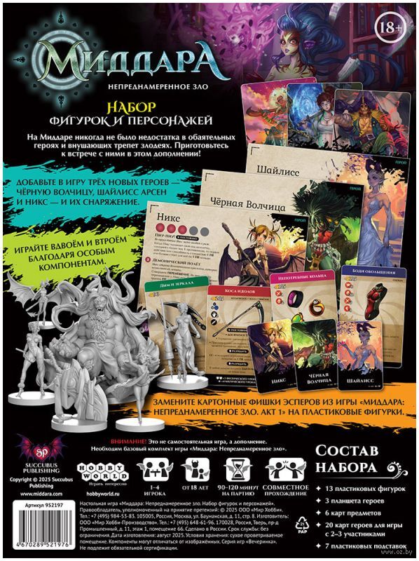 Добавьте в игру трёх новых героев – Чёрную Волчицу, Шайлисс Арсен и Никс – и их снаряжение. Играйте вдвоём и втроём благодаря особым компонентам. Замените картонные фишки эсперов из игры "Миддара: Непреднамеренное зло. Акт 1" на пластиковые фигурки.