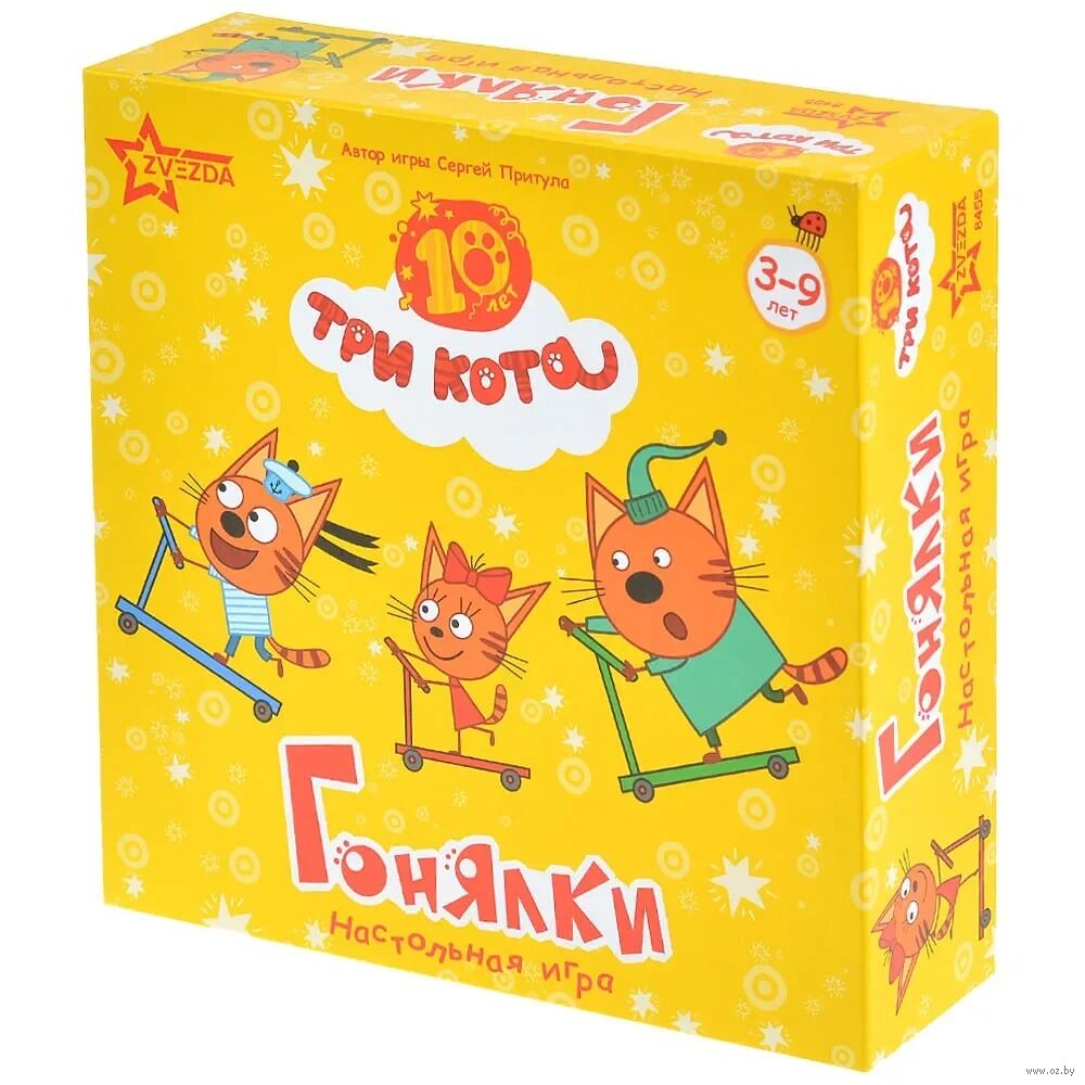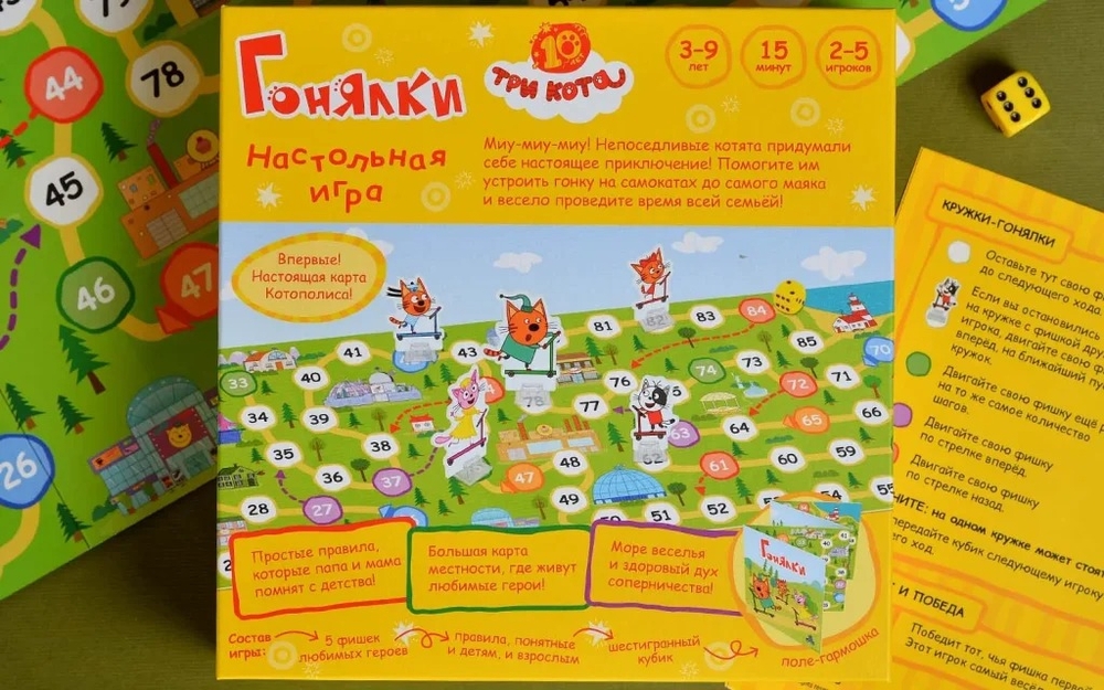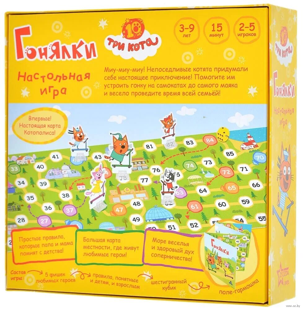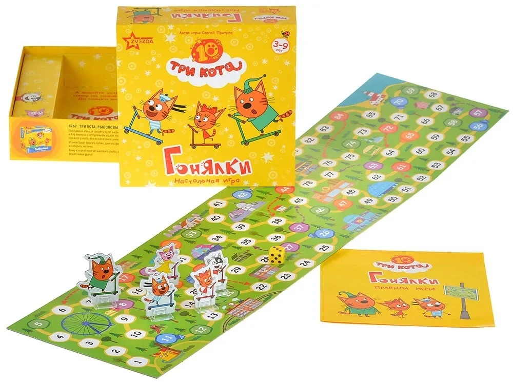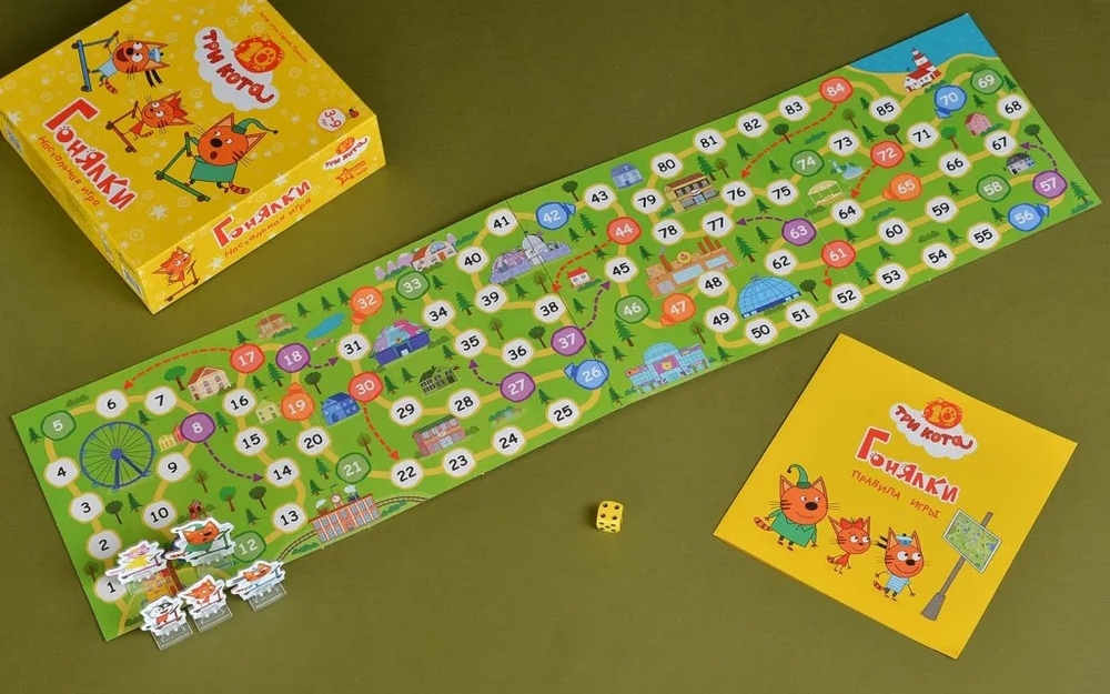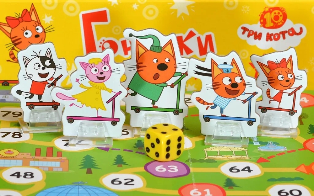 "Три кота: Гонялки" – это весёлая и динамичная игра-ходилка для всей семьи. Выберите одну из фигурок героев мультфильма и скорее выкатывайте свой самокат на старт!