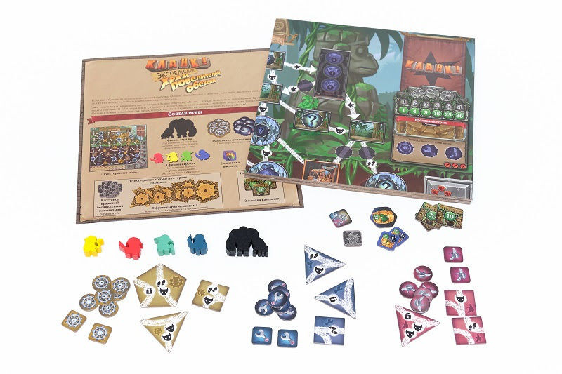 В коробке вас ждёт двустороннее игровое поле с картами джунглей и храма, а также новая механика вращающихся комнат, которые можно поворачивать специальными примативными инструментами.