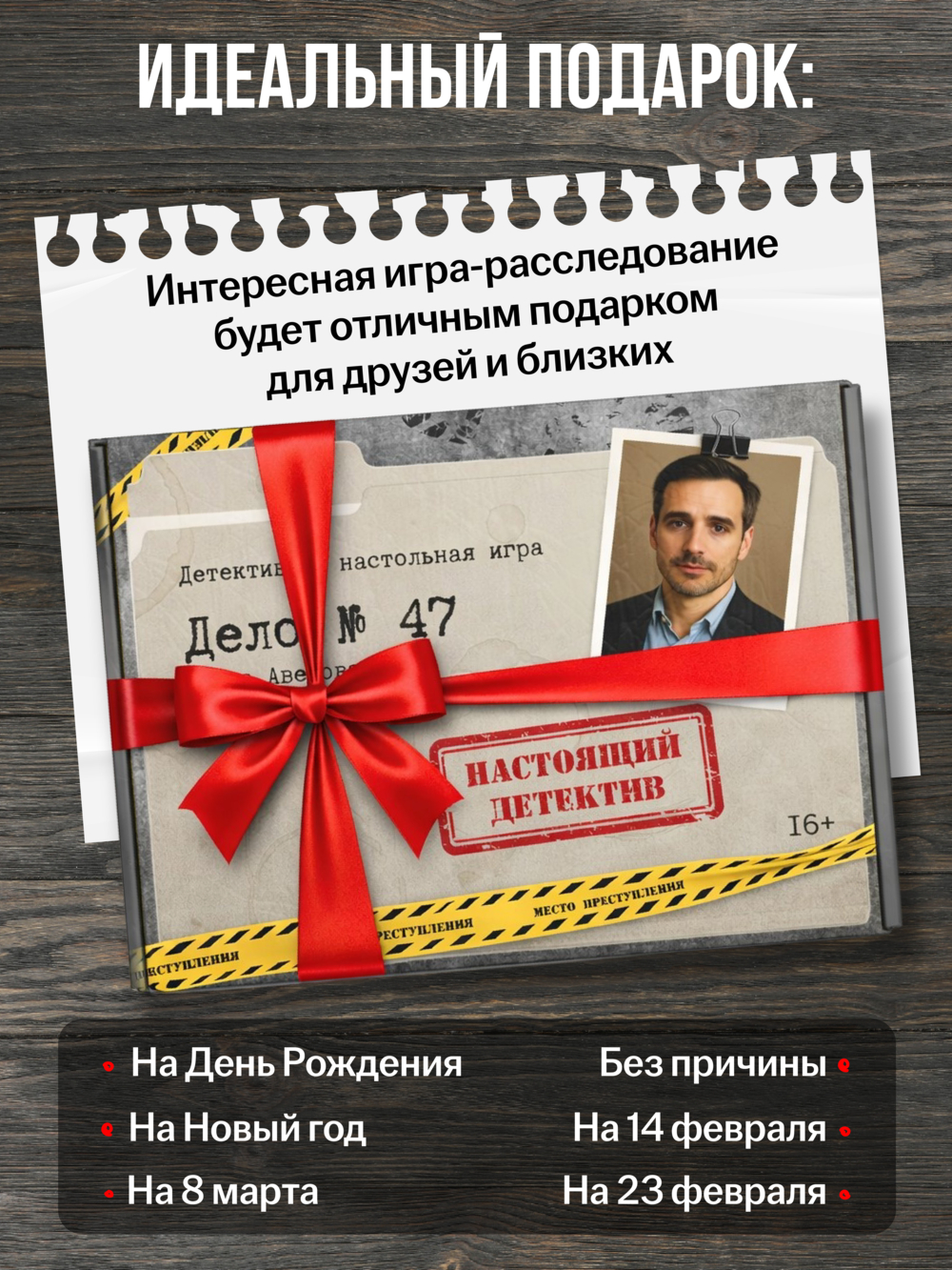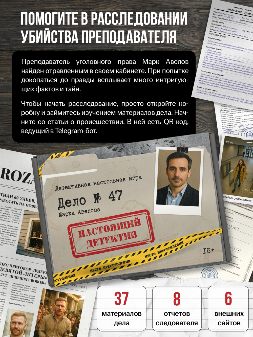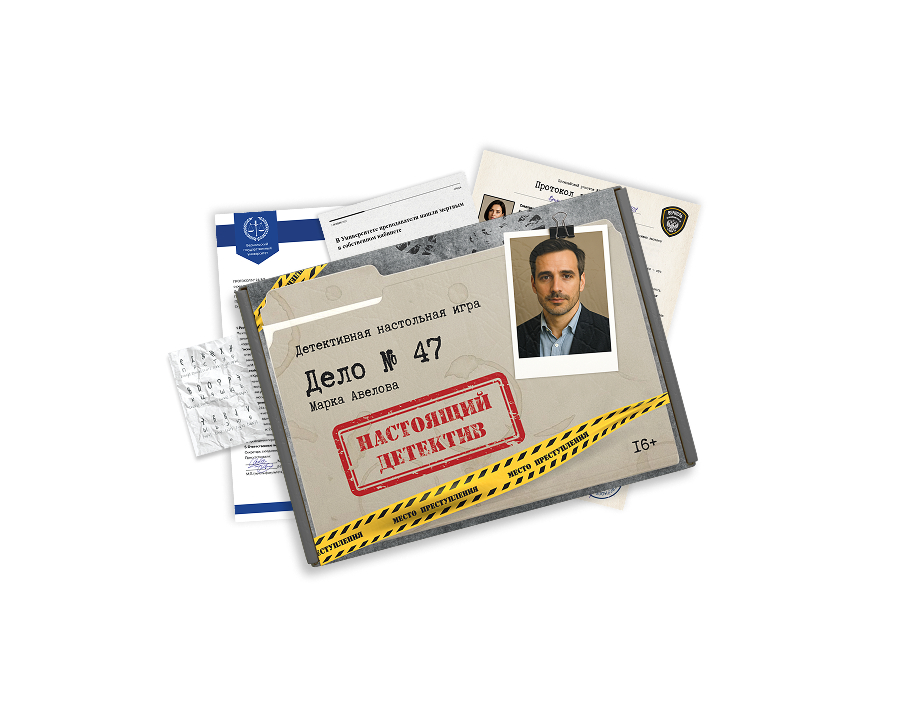Настольная детективная игра "Настоящий детектив. Дело № 47 Марка Авелова" – это увлекательная история, в которой игроки становятся участниками настоящего расследования. В центре сюжета – загадочная смерть преподавателя университета, отравленного при невыясненных обстоятельствах. Постепенно изучая материалы дела, вы будете раскрывать тайны прошлого, сопоставлять факты, расшифровывать сообщения и шаг за шагом приближаться к истине.