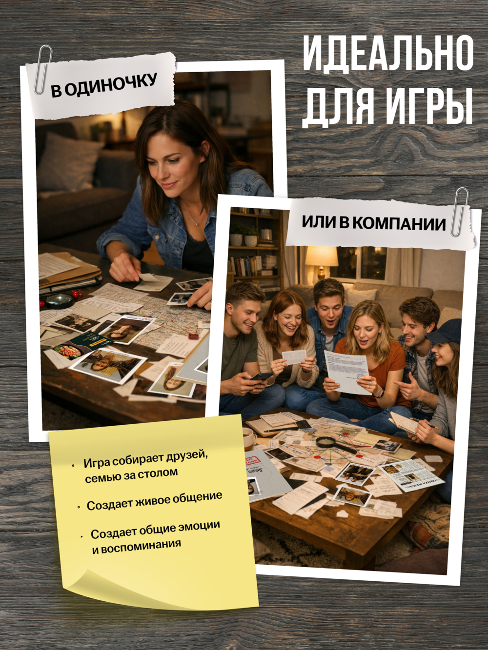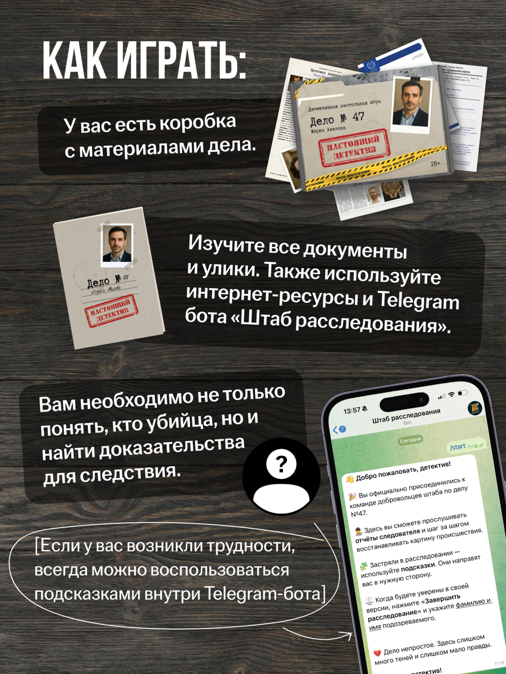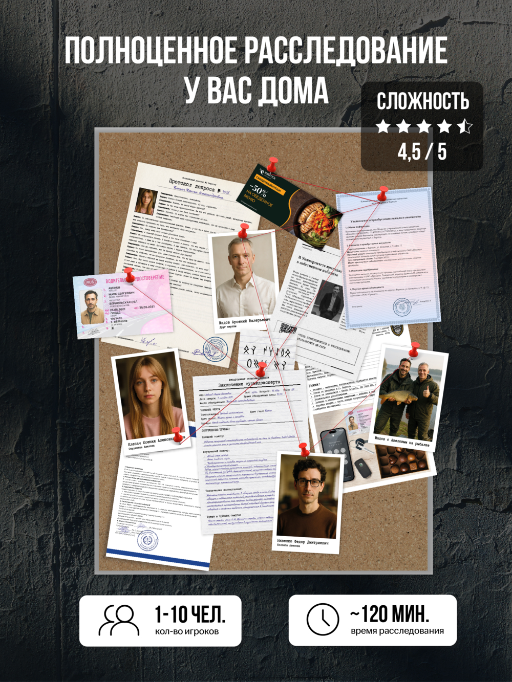 Настольная детективная игра "Настоящий детектив. Дело № 47 Марка Авелова" – это увлекательная история, в которой игроки становятся участниками настоящего расследования. В центре сюжета – загадочная смерть преподавателя университета, отравленного при невыясненных обстоятельствах. Постепенно изучая материалы дела, вы будете раскрывать тайны прошлого, сопоставлять факты, расшифровывать сообщения и шаг за шагом приближаться к истине.