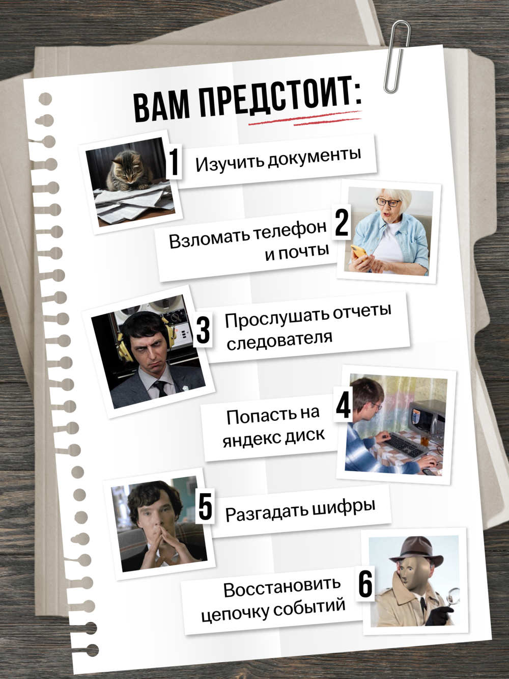 Вам предстоит изучать статьи, документы, допросы, цифровые улики, взламывать телефон, анализировать переписки, работать с почтой и разгадывать шифры.