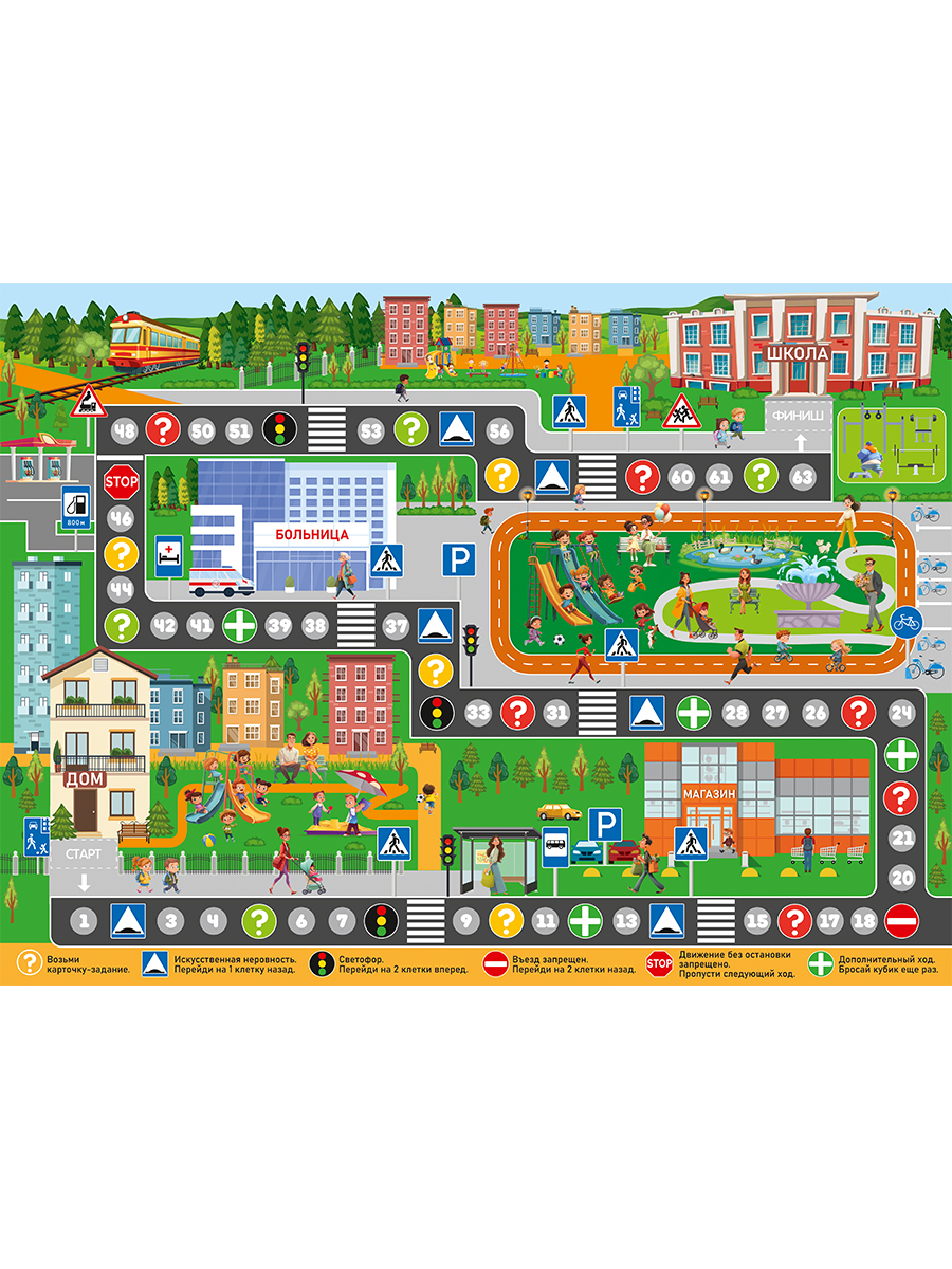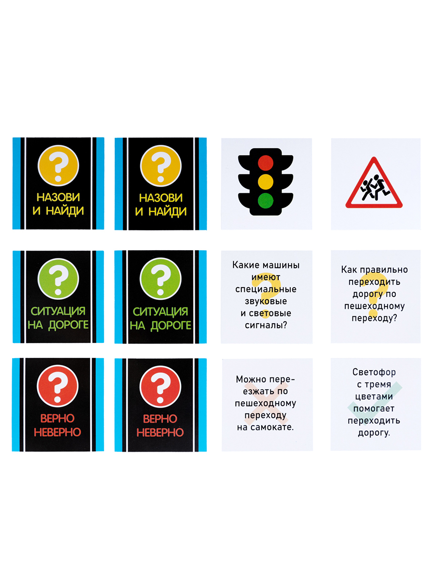 Особый интерес представляют специальные клетки со знаками – своеобразные подсказки и испытания, которые сделают игру еще более динамичной и познавательной. А если вам попадется клетка со знаком вопроса, готовьтесь проверить свои знания в неожиданной ситуации! Тяните карту из соответствующей стопки и выполняйте задание: отвечайте на вопросы, называйте и находите знаки, анализируйте ситуации на дороге.