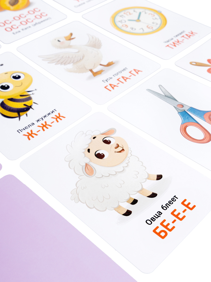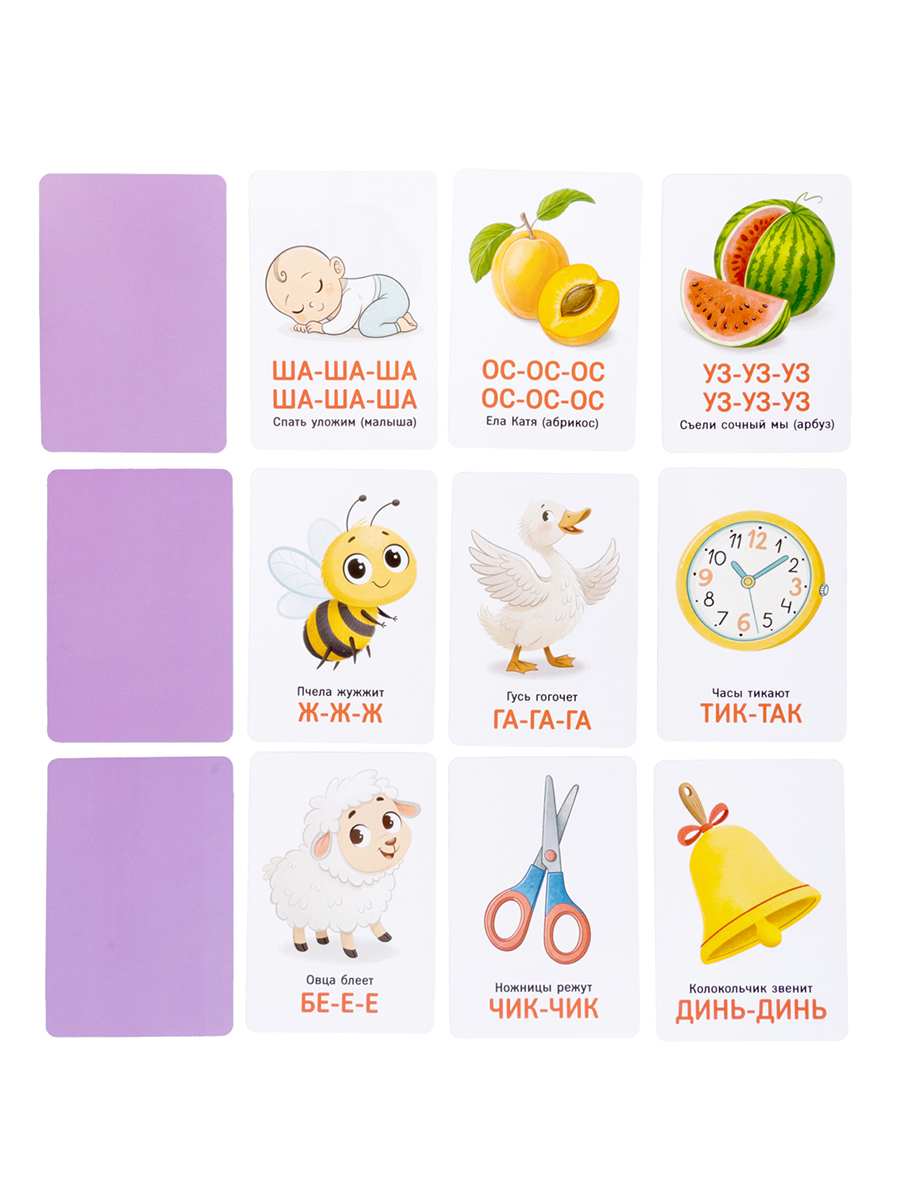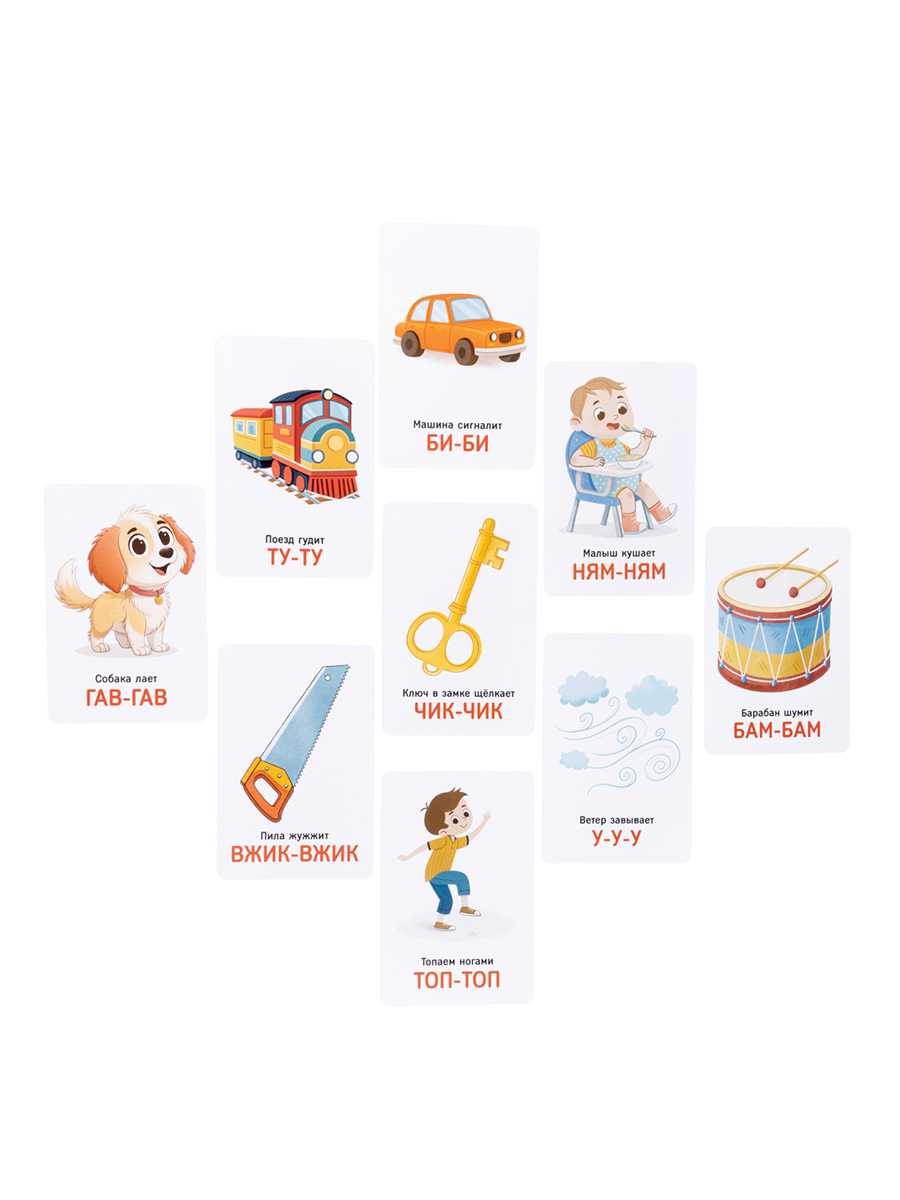 Обучающие карточки со звукоподражаниями – простой и увлекательный способ развивать речь и слух малыша. Ребёнок учится различать звуки, подражать им и запоминать новые слова. Эти карточки – отличный инструмент для стимулирования раннего развития речи у детей. Яркие иллюстрации и реалистичные звукоподражания помогают ребенку связывать услышанное слово с конкретным образом, что значительно облегчает процесс запоминания и расширения словарного запаса.