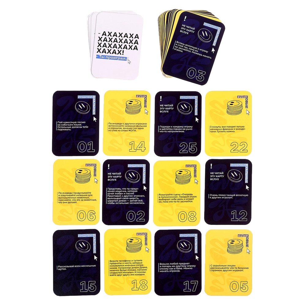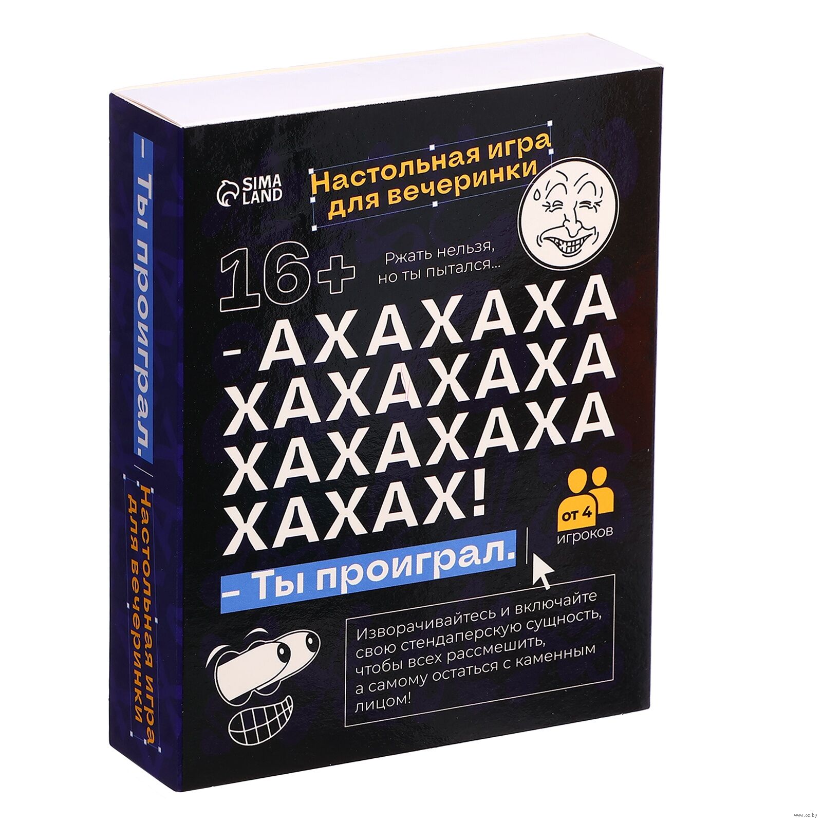 "АХАХА! Ты проиграл" – настольная игра для весёлой компании. В этой настолке игроку предстоит проявить остроумие и харизму, чтобы всех развеселить, а самому не поддаваться на провокации и сохранить невозмутимое лицо. Будет уморительно весело!