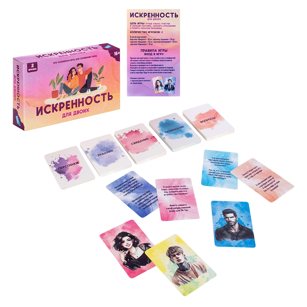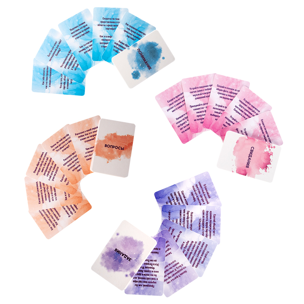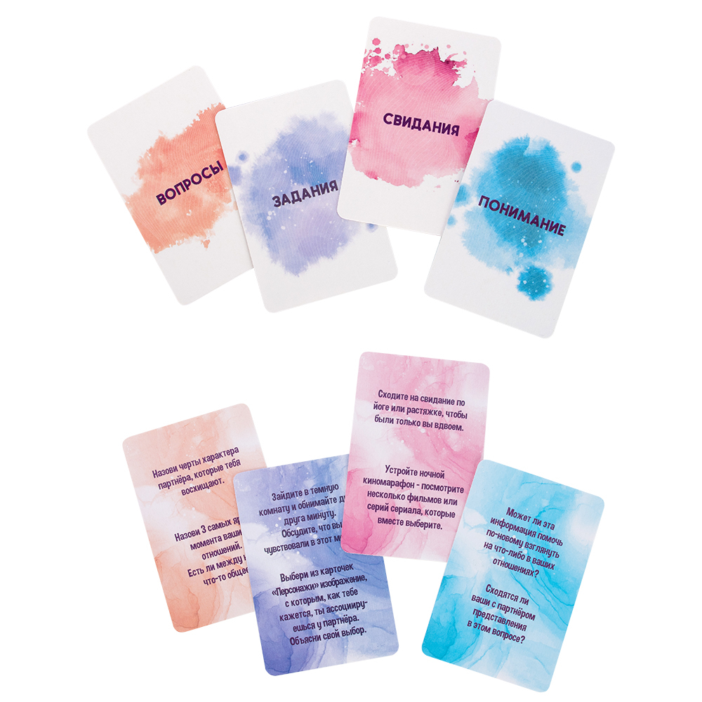 Каждый игрок выбирает себе карточку персонажа. Игроки по очереди тянут карточки из категорий "Вопросы", "Задания" и "Свидания" и после ответа при помощи карточек "Понимание" анализируют ответы. После 2-4 карточек из каждой категории, игроки уже смогут почувствовать результат и нащупать точки роста. В игре нет победителей и проигравших, если вы открыли эту игру, вы уже выиграли.