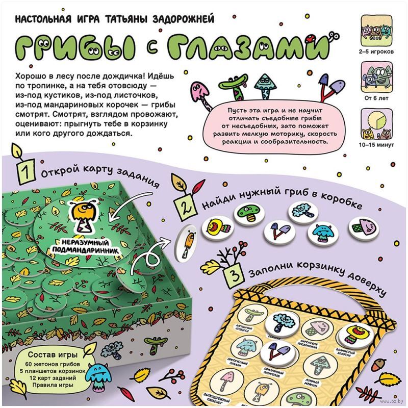 Хорошо в лесу после дождичка! Идёшь по тропинке, а на тебя отовсюду – из-под кустиков, из-под листочков, из-под мандариновых корочек – грибы смотрят. Смотрят, взглядом провожают, оценивают: прыгнуть тебе в корзинку или кого другого дождаться. Кто первым соберёт их все?