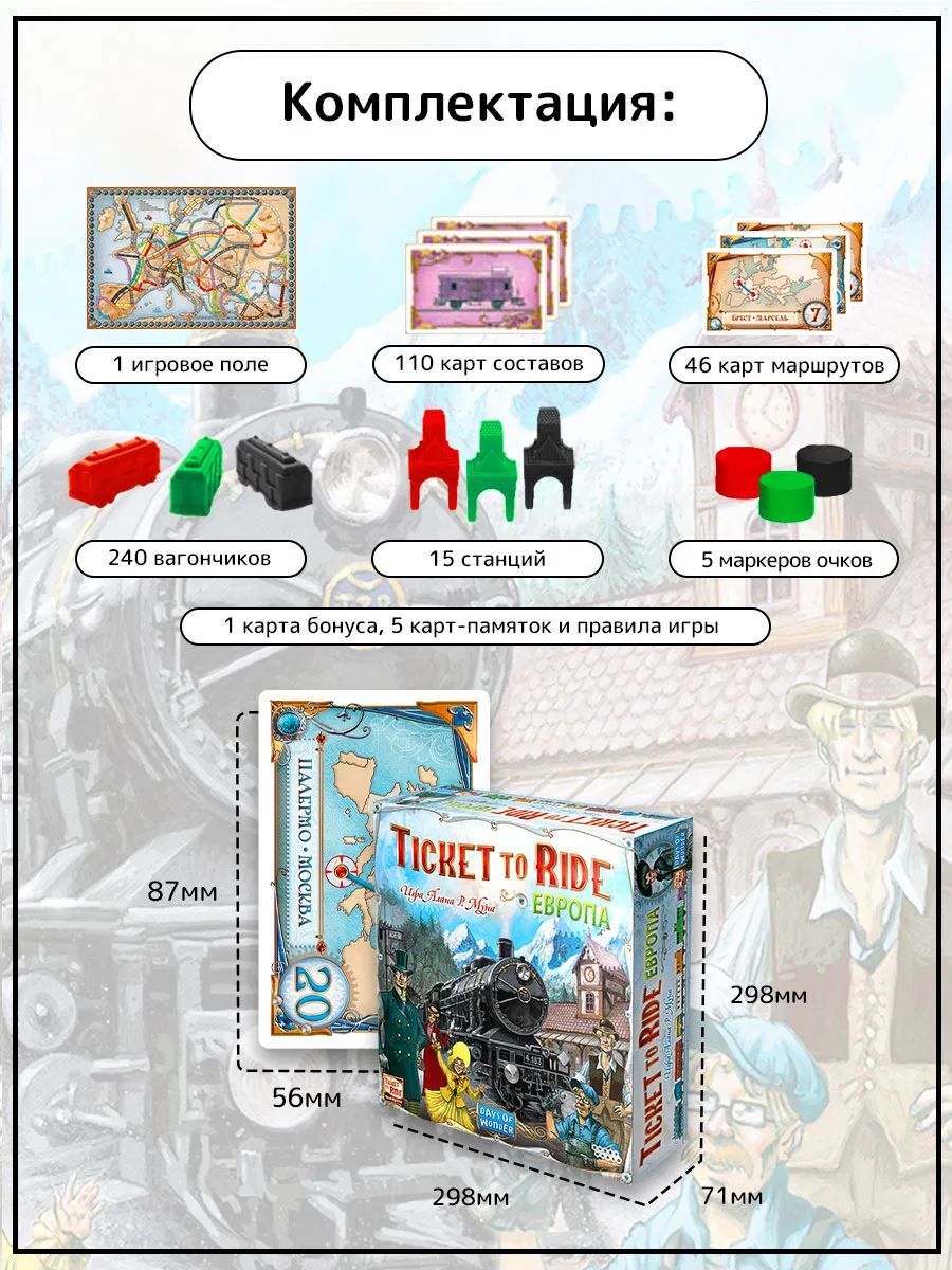 На игровом поле изображена карта Европы по состоянию на начало XX века с городами, соединёнными разноцветными железнодорожными путями. В игре два вида карт: для прокладывания путей используются карты поездов (вагоны восьми цветов, соответствующих железным дорогам, а также локомотивы-джокеры), а задания указаны на картах маршрутов: два города, которые надо соединить, и призовые очки за выполнение. 6 маршрутов длинные: они пересекают всю Европу и приносят по 20 и больше очков. В начале партии каждый участник получает по 4 карты поездов, по 1 карте длинного маршрута и по 3 карты обычных маршрутов. До двух маршрутов можно после этого сбросить. Также в распоряжении каждого игрока – 45 пластиковых вагончиков, 3 пластиковые станции и 1 фишка для подсчёта очков.