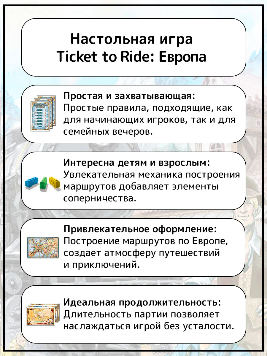 Вторая игра серии Ticket to Ride предлагает игрокам принять участие в новом соревновании по соединению городов железнодорожными маршрутами. На этот раз локомотивы потянут разноцветные вагончики по рельсам Европы.