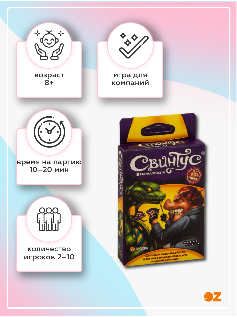 Цель игры предельно проста – избавьтесь от всех своих карт. Но сделать это ой как не просто... Свинская бюрократия способна кого угодно свести с ума бесконечными картами предписаний. И конечно, нужно всегда оставаться начеку! Змеиные карты этикета позволят игрокам наказывать друг друга буквально за что угодно! Теперь вам придётся следить не только за картами, но и за своей речью, жестами, взглядами...