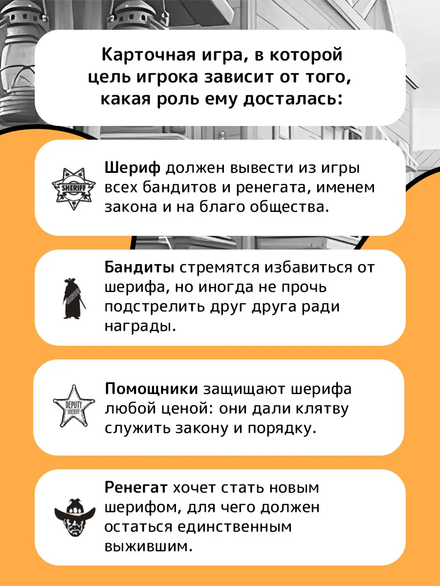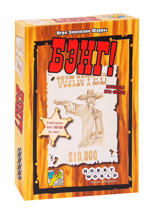 В игре "Бэнг!" вы станете одним из легендарных персонажей Дикого Запада – от Малыша Билли до Неуловимого Джо. Вам достанется тайная роль – шерифа, его помощника, бандита или ренегата – от которой зависят ваша игровая цель. Средства для её достижения – в комплекте: дикие мустанги и роковые красотки, салуны и дилижансы, и, конечно, целый арсенал верного оружия.