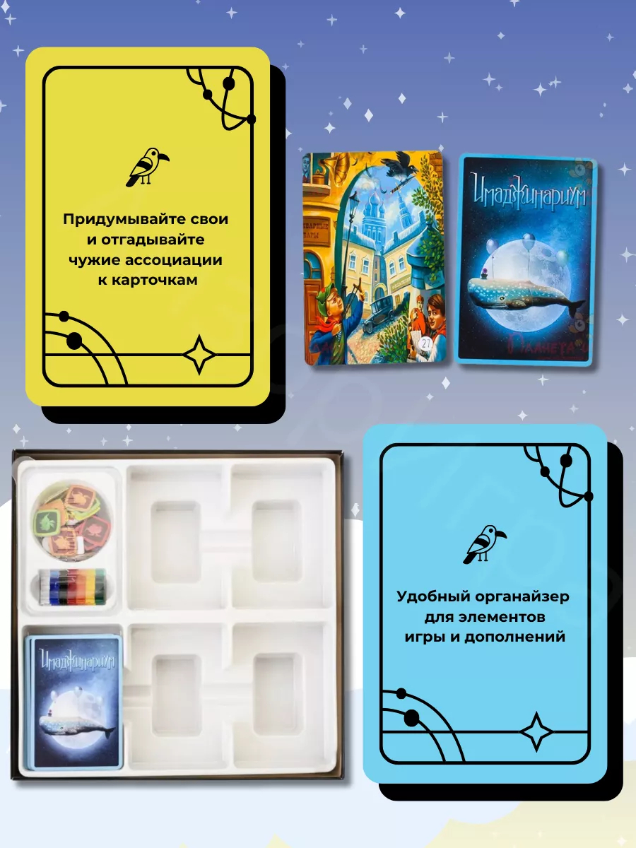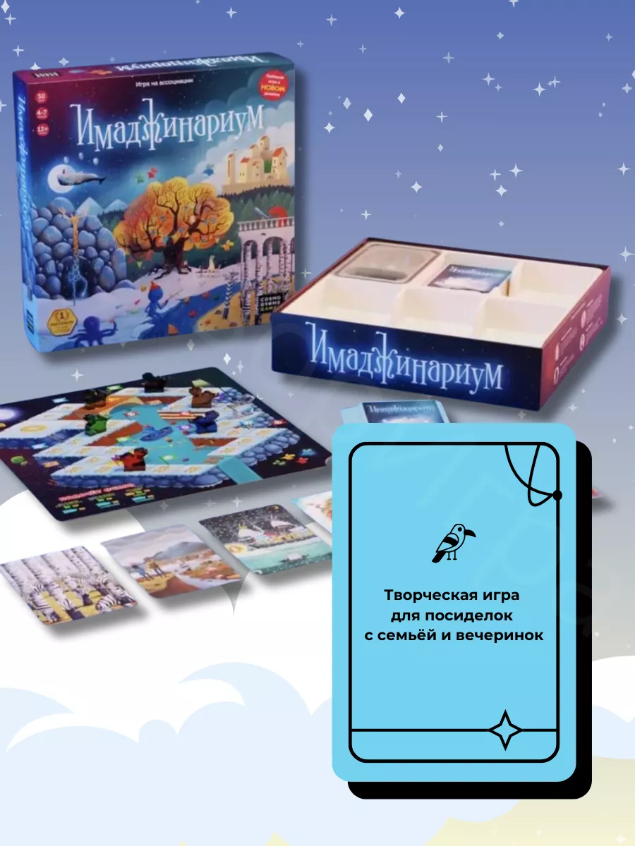 "Имаджинариум" – это культовая настолка, этакий повзрослевший и обрусевший Dixit. Правила просты: игрок придумывает ассоциации к своим картам и угадывает карты других игроков по их ассоциациям. Одновременно может играть до 7 человек.