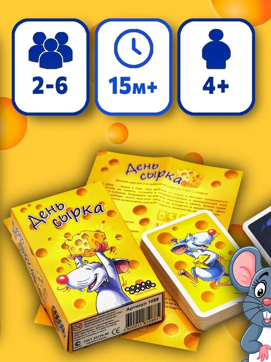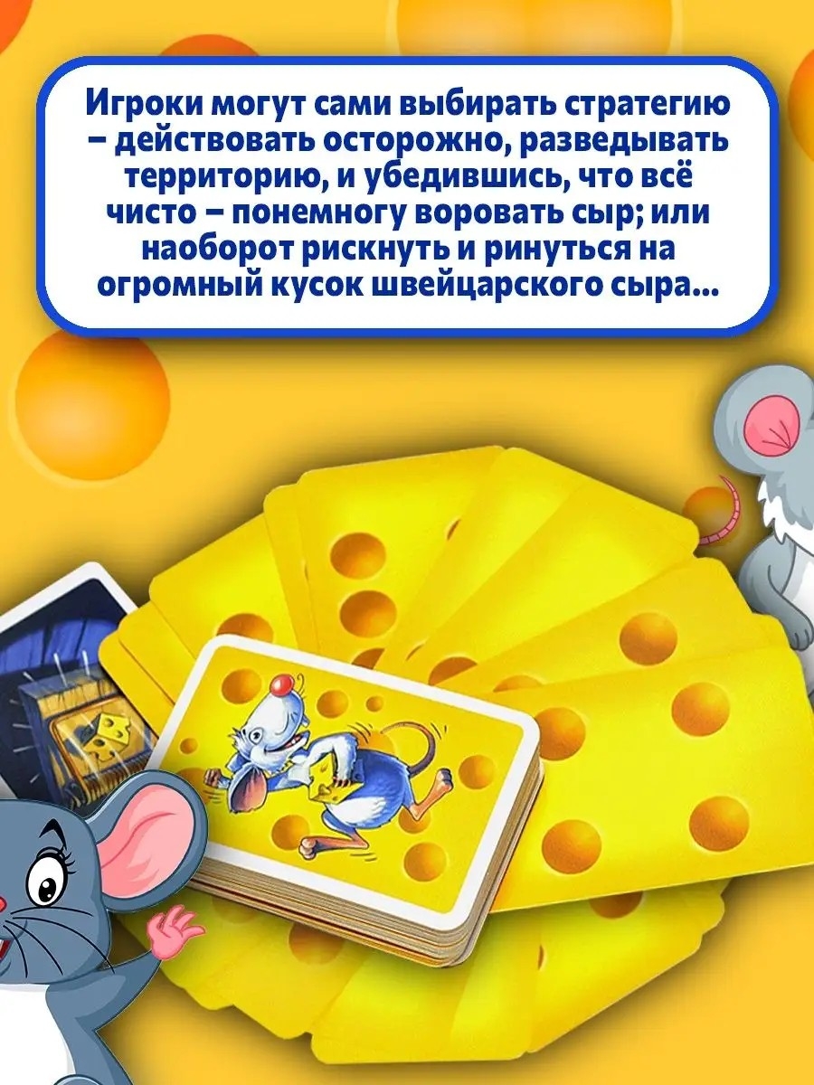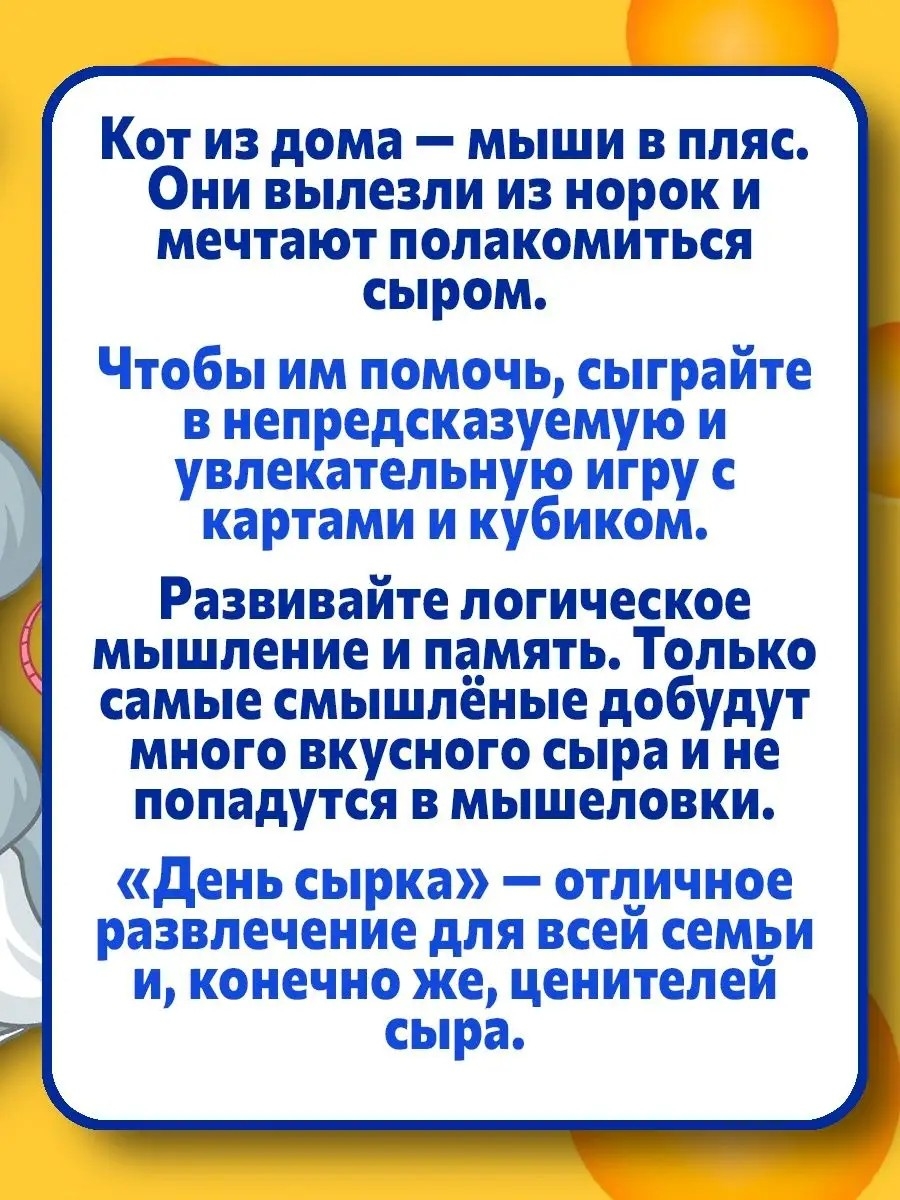 "День сырка" – детская карточная игра, где игроки выступают в роли мышей, которые покинули норки и шныряют по дому в поисках вкусного сыра. И чем дырявее сыр, тем он лакомее, но и тем больше шанс, что он является ничем иным, как приманкой для мышеловки.