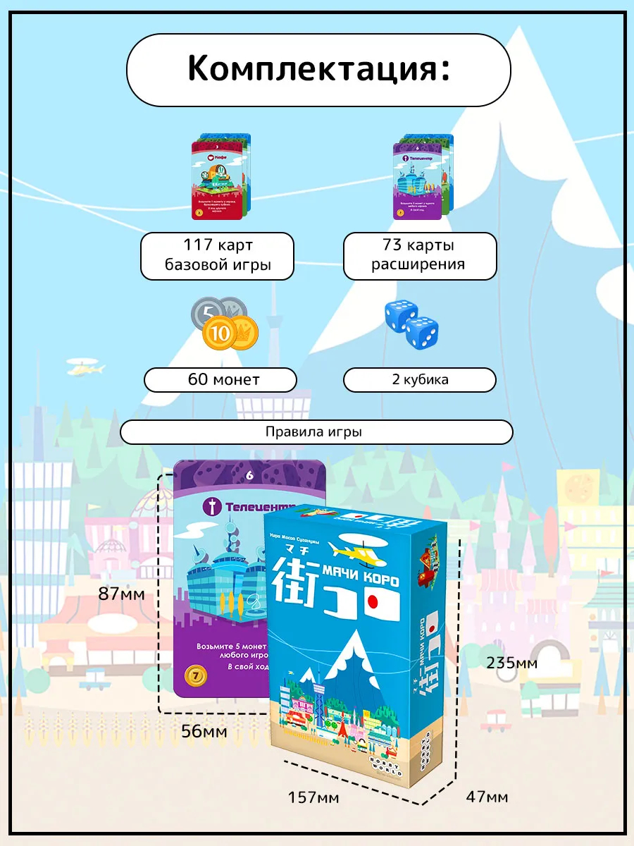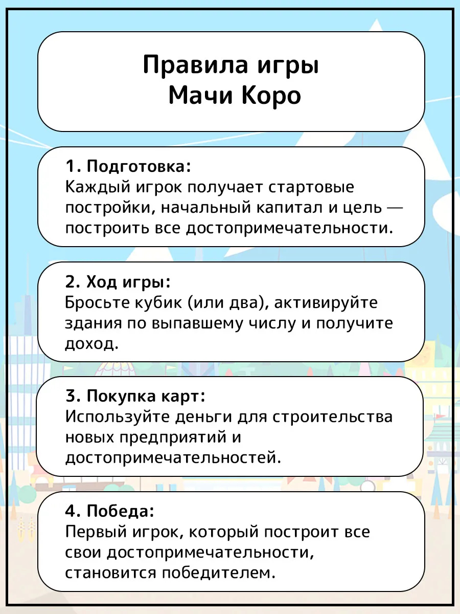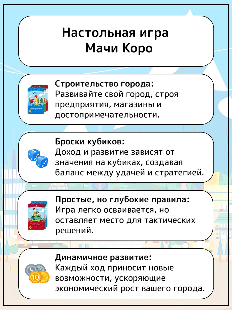 В игре "Мачи Коро" вам предстоит строить город мечты, вкладывая в него весь свой талант и вдохновение. Приобретайте различные предприятия: каждое из них по-своему дополнит ваш город, а также пополнит казну. Главное, не забывайте строить достопримечательности, ведь именно они привлекут в город туристов и приведут к победе.