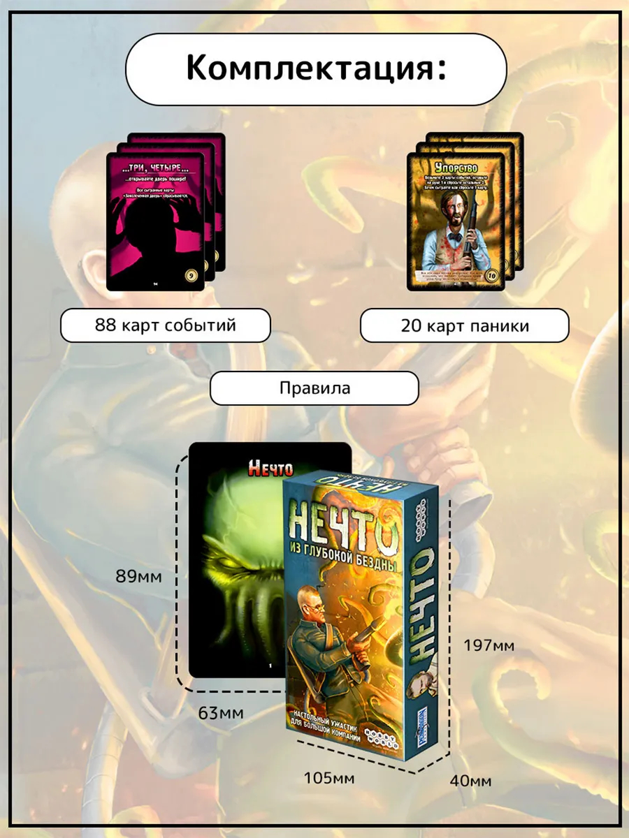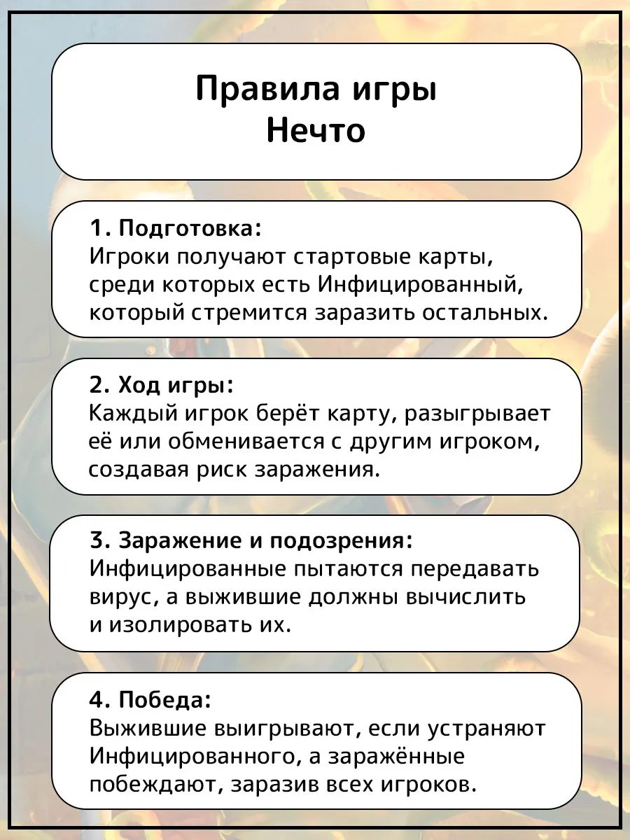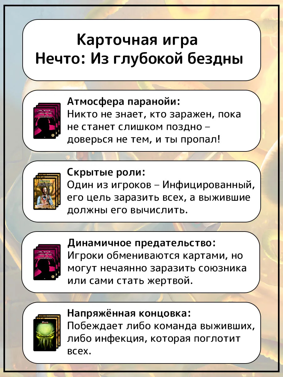 "Нечто" – настольная игра для больших компаний, которая проверит вашу интуицию, находчивость и крепость нервов. Разыгрывая и обменивая карты, вы будете пытаться вычислить игрока, которого поработило таинственное Нечто.