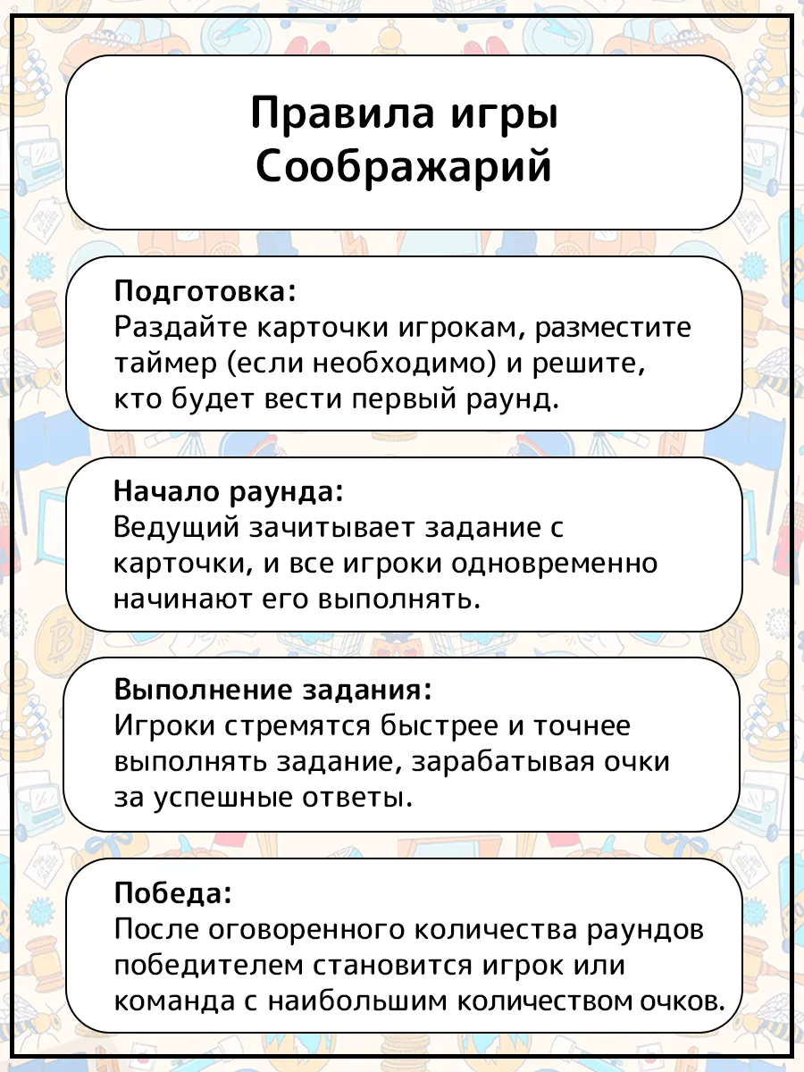 "Соображарий" – игра для вечеринок и семейных посиделок, которая одинаково понравится и детям, и взрослым. Каждый ход вы будете тянуть из колоды карты букв и категорий – а потом проявлять чудеса реакции, пытаясь первым вспомнить подходящее слово. Чтобы победить в этой игре, не нужно быть самым эрудированным – нужно просто быстрее всех соображать!