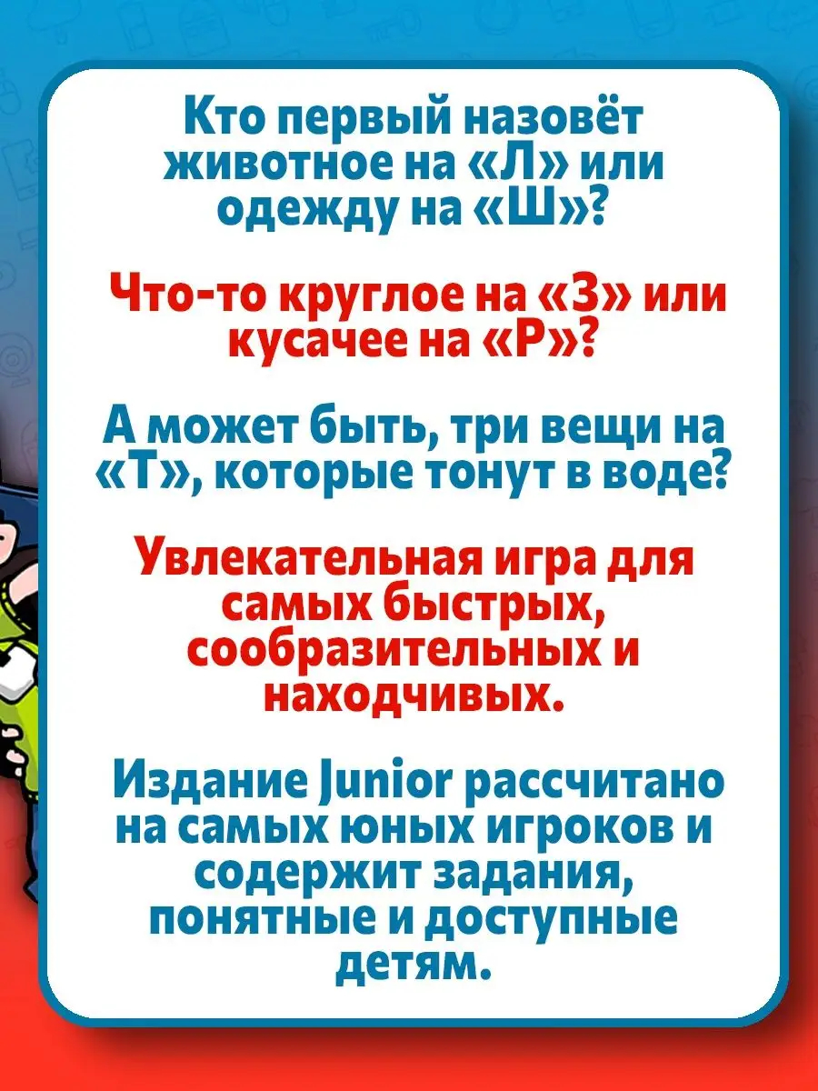 "Соображарий" – увлекательная игра для самых быстрых, сообразительных и находчивых. Издание Junior рассчитано на самых юных игроков и содержит задания, понятные и доступные детям.