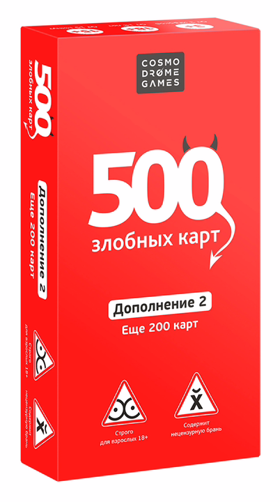 200 новых карточек с вопросами и ответами – и тысячи возможных комбинаций, каждая из которых может вызвать хохот. Юмор стал чернее, карты стали белее, а коробка стала удобнее. Все остальное осталось по-прежнему.