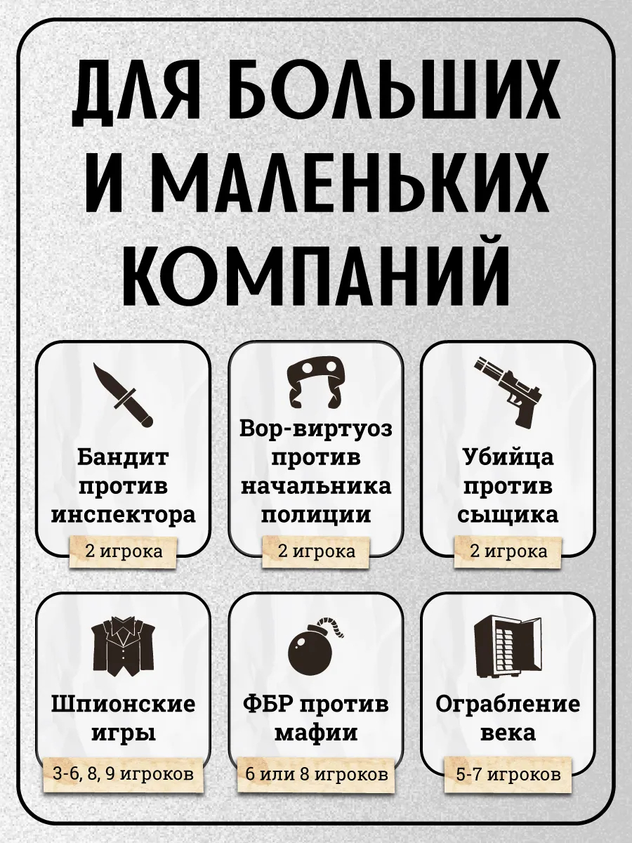 Почувствовать себя сыщиком, идущим по следу опасного шпиона или же, напротив, тем самым шпионом, скрывающимся от хитроумного соперника, могут как взрослые, так и дети от 13 лет – правила игры изучаются за считанные минуты, а игровой процесс затягивает не на шутку. Благодаря разным режимам игры Нуаром можно наслаждаться как вдвоем, так и большой компанией.