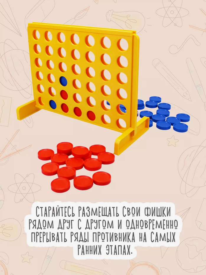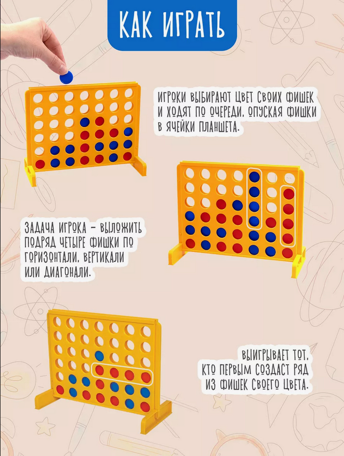Игроки ходят по очереди. В свой ход игрок опускает фишку своего цвета в любоую прорезь планшета. Выигрывает тот, кто первым выстрои ряд из 4-х фишек в одном из направлений: горизонтальном, вертикальном или по диагонали.