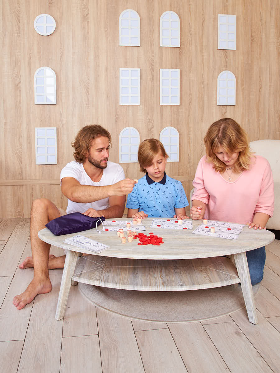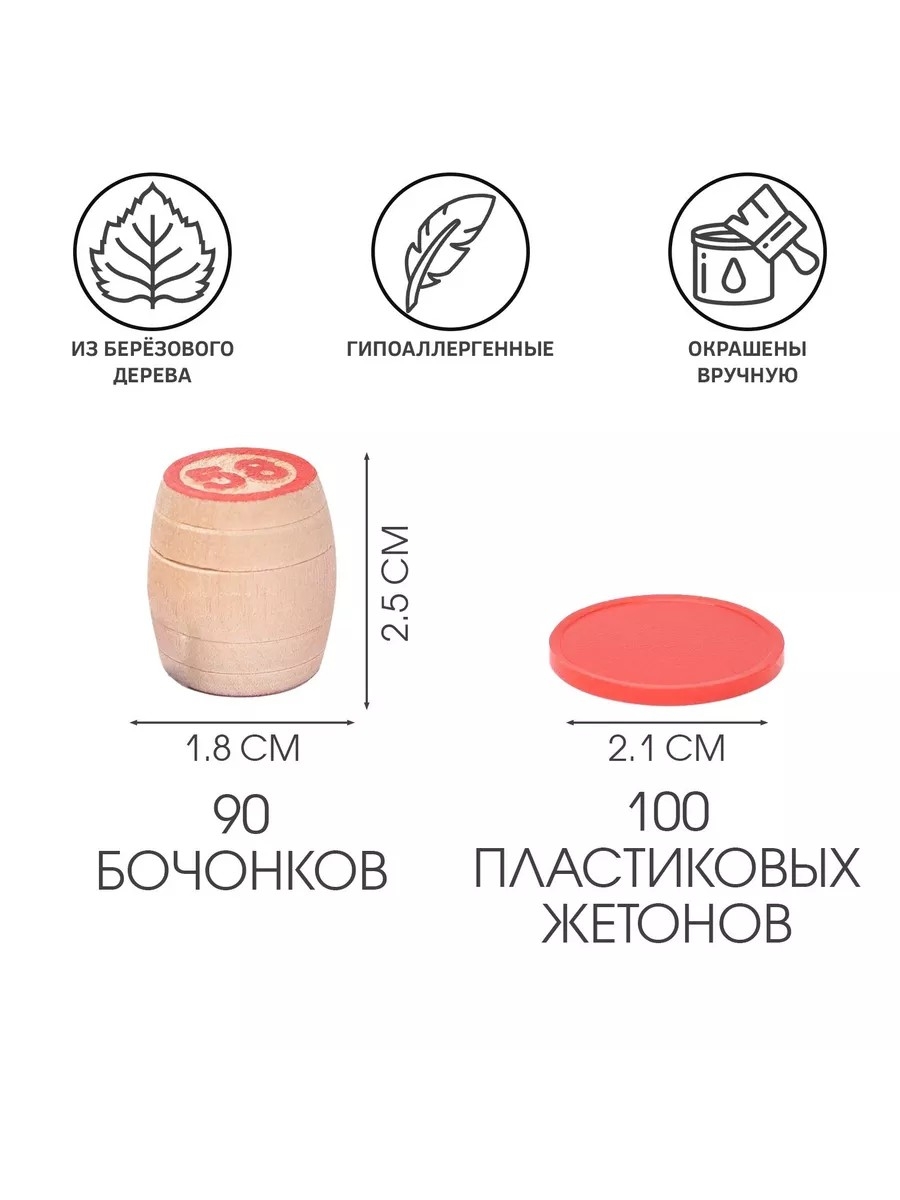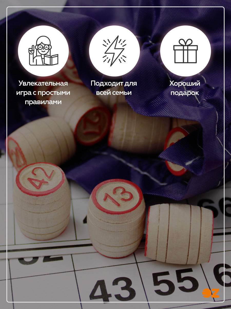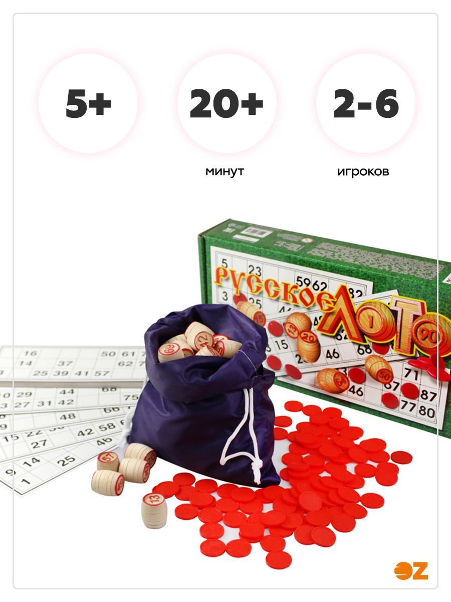 Настольная игра "Русское лото" включает в себя 24 карточки, разделенные на клетки. Специальные пронумерованные бочонки, выполненные из дерева, нужно перемешать в мешке и, вытаскивая не глядя, собрать на своем поле указанные числа.