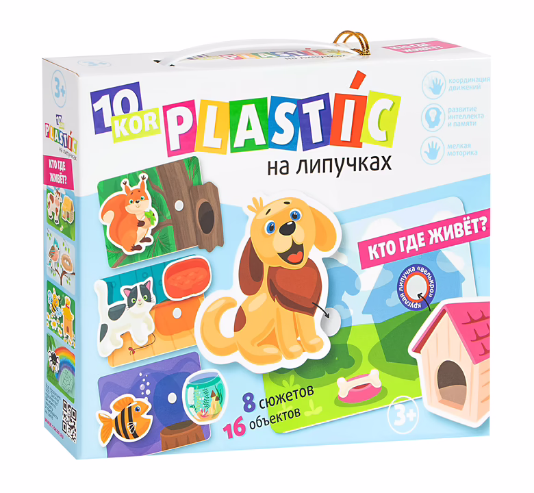 Игра состоит из карточек и объектов, выполненных из высококачественного безопасного пластика. Объекты крепятся к карточкам с помощью липучек "Велькро". Ребёнок должен найти, какие объекты прикрепить к определённой карточке, и точно соединить липучки, чтобы фигурка крепко держалась на картинке.