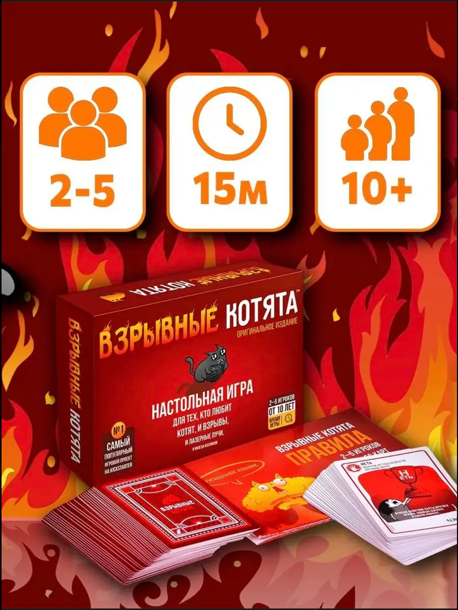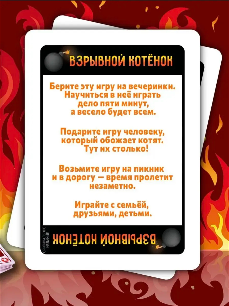 Перед вами стратегическая версия "русской рулетки", заряженная котятами. Игроки по очереди берут карты из колоды, пока кто-то из них не вытянет взрывного котёнка.