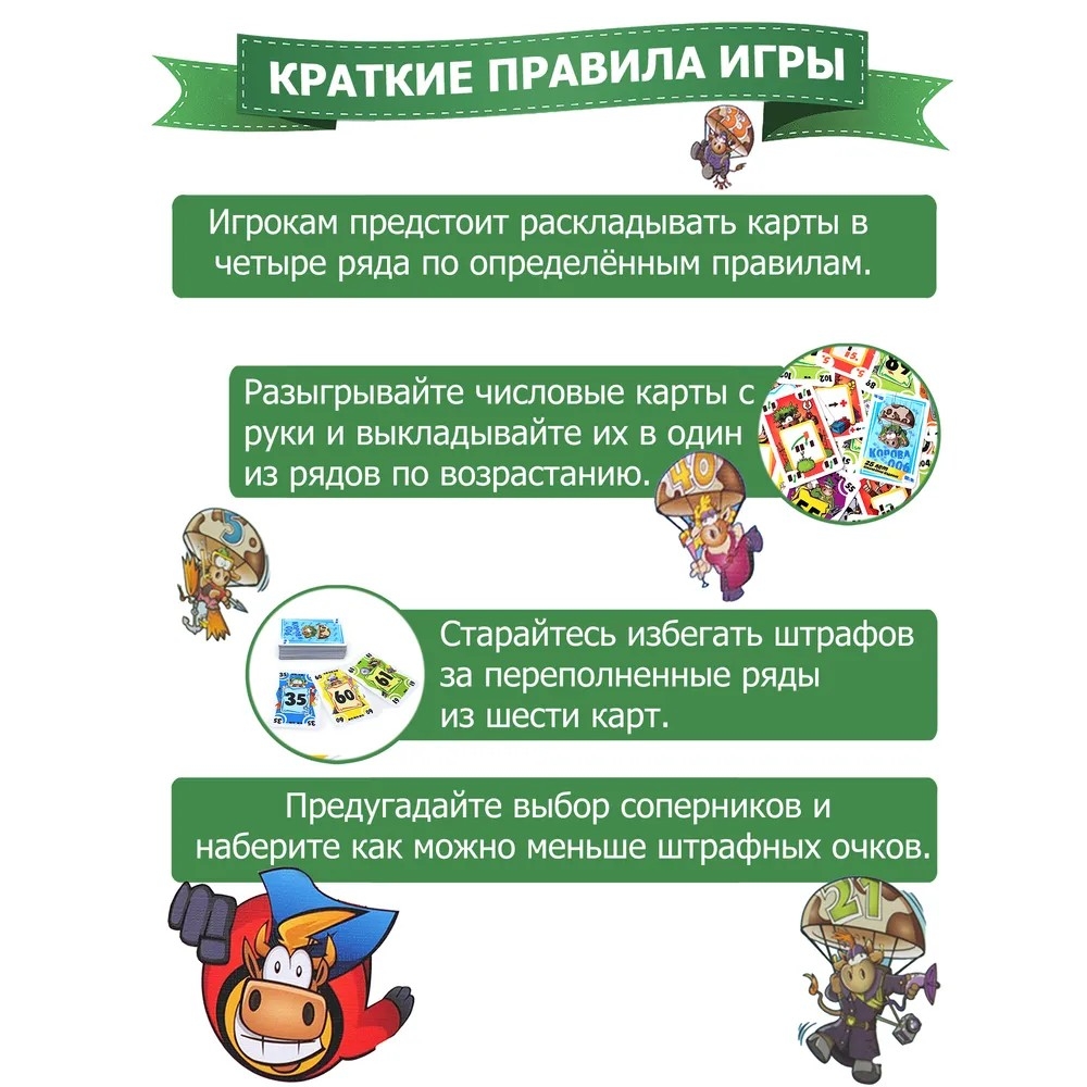 Отличная игра!! Частенько с крестником в нее играем. Конечно, если игроков больше двух, то получается более непредсказуемо. Обычные карты давно не достовали. Яркая, незамысловатая, веселая и интересная. Правила понятны и быстро запоминаются. Лично я не люблю игры с сильно замудреными правилами. Особенно понравилось, что при подсчете штрафных очков - в прямом смысле считаются очки, изображенные на картах коров-агентов)) Рекомендую к покупке!