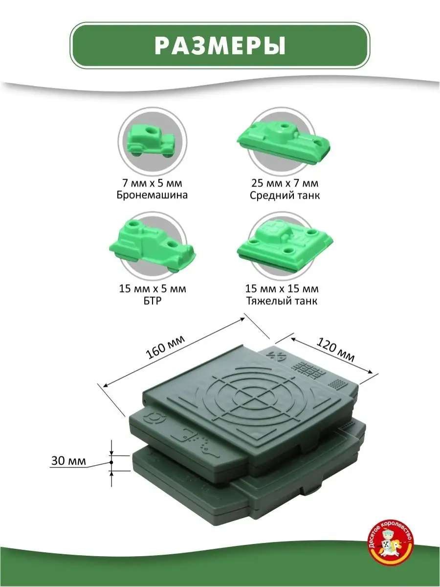 На нижнем поле расставьте свои танки так, чтобы они не касались друг друга. На верхнем поле отмечайте результаты стрельбы по противнику. Отмечайте белыми фишками на поле промахи, а красными – попадания. Играйте до полного уничтожения всех танков: стреляйте по очереди или передавайте ход только после промаха.