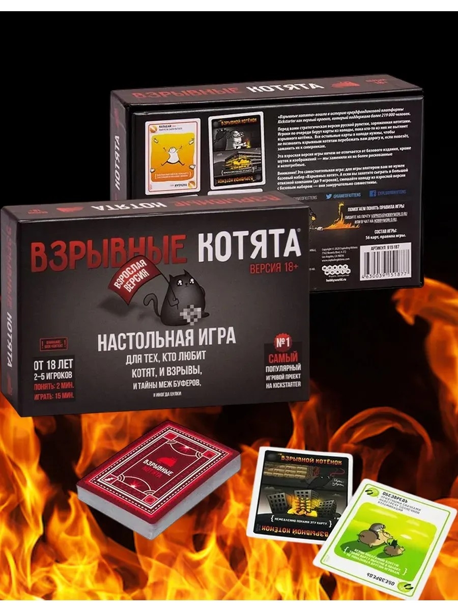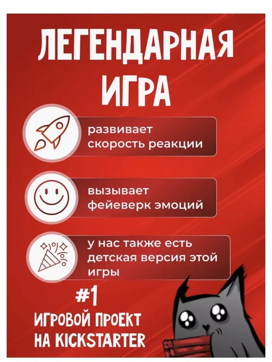 Перед вами стратегическая версия русской рулетки, заряженная котятами. Игроки по очереди берут карты из колоды, пока кто-то из них не вытянет взрывного котёнка. Все остальные карты в колоде нужны, чтобы не позволить взрывным котятам перебежать вам дорогу и, если повезёт, заманить их к соперникам.