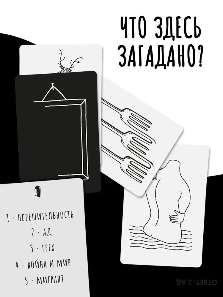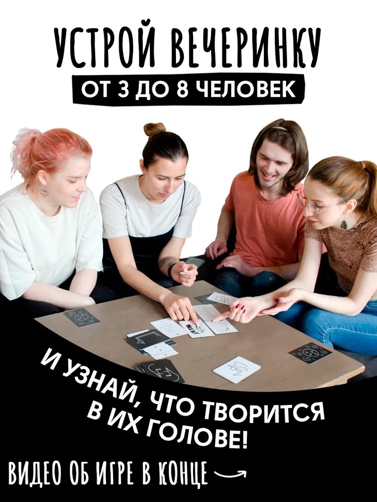 В свой ход вы будете объяснять слова с помощью необычных изображений на картах. Их нужно использовать от одной до семи и раскладывать как угодно. Можно хоть домики из них строить, главное – чтобы остальные вас поняли. Или не совсем поняли – зависит от вашей роли.